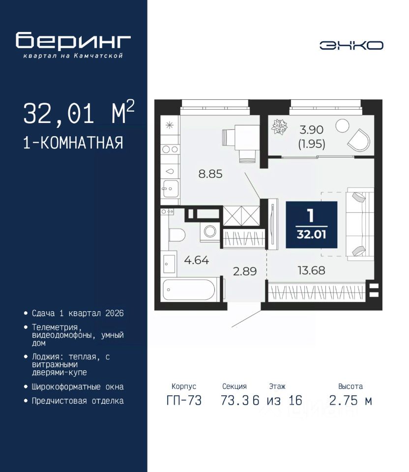 1-комн. квартира с предчистовой отделкой в ЖК ''Беринг'' на 6 этаже. Общая площадь: 32.01 кв.м., жилая: 13.68 кв.м., площадь кухни: 8.85 кв.м. Все окна выходят на одну сторону. В квартире одна лоджия, один совмещенный санузел. Высота потолков 2.75 м. Дом монолитный, многоподъездный, переменной этажности, от 9 до 22 этажей. Квартира находится в 73.3-й секции высотой 16 этажей в корпусе ГП-73. На этаже 8 квартир. В подъезде 1 пассажирский и 1 грузовой лифт. Окончание строительства - 1 квартал 2026 года. Оформление сделки по договору долевого участия. Подобно знаменитому исследователю, мы чувствуем себя первооткрывателями этой локации. Хотим показать новую суть места, сформировать для вас жизненный опыт, которого ещё не было. Беринг — район зелёного цвета. Беринг — район, который откроется вам с другой стороны. Впечатлит новым уровнем комфорта и качеством жизни. Беринг — открытие на карте города. Первый квартал расположен в районе Тура, в границах улиц: Камчатская Западносибирская Энтузиастов. Вокруг уже есть всё для того, чтобы ежедневная рутина была лишь частью жизни и не доставляла дискомфорта. Школы и детские сады, магазины и аптеки, поликлиника, места для семейного отдыха, пеших и велопрогулок, и даже рыбалки. Масштабное озеленение дворов — визитная карточка ЭНКО и ваш оазис спокойствия, чтобы отвлечься от повседневности. Раскидистые деревья, кустарники, травы и цветы — осталось остановиться, вдохнуть и расслабиться, глядя на эту природную красоту. Стилистика подъездов продолжает концепцию Беринга, вдохновлённого Камчаткой: сдержанный, но при этом впечатляющий дизайн соседствует с удобством и функциональностью. #2UswD4