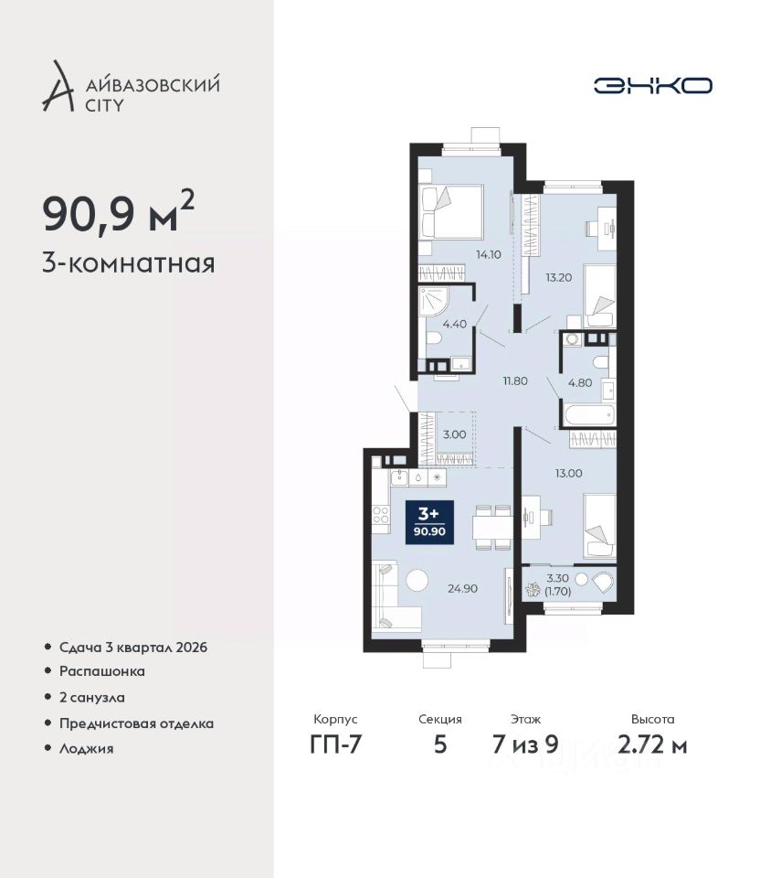 Продаётся квартира площадью 90.63 м2 в жилом комплексе ''Дабл-Дабл''. Квартира находится на 1 этаже, жилая площадь квартиры 42.46 м2, площадь просторной кухни — 13.54 м2. Среди особенностей планировки — изолированные комнаты с окнами на одну сторону, 1 совмещённый санузел. Срок сдачи — II кв. 2028 Жилой комплекс ''Дабл-Дабл'' — это: - проект комфорт-класса на Московском тракте - дома высотой 15 этажей - квартиры от 1-комнатных до 2-уровневых Окружение На границе жилого комплекса — живописный лес. Достаточно открыть окна, чтобы впустить в комнаты ароматы зелени, прохладу и чистый воздух. Благоустройство Юные жители оценят игровые площадки и воркаут-зоны. Любителям неспешных прогулок понравится 2-уровневый променад с панорамным видом и навесами. Лобби Помещения встречают дизайнерскими интерьерами с уютными лаунж-зонами, где удобно подождать курьера или просто сделать паузу перед возвращением домой. Колясочные Возвращайтесь налегке после прогулки с малышом — оставить коляску можно в специальном помещении на первом этаже. Кладовые Благодаря индивидуальным помещениям на техническом этаже сезонные и габаритные вещи будут на своём месте. 2-уровневые квартиры Просторная гостиная и кухня располагаются на первом этаже, спальня и кабинет — на втором. Почувствуйте, как жизнь выходит на новый уровень комфорта и приватности. Панорамное остекление Окна в пол наполняют комнаты светом и стирают границы между домом и природой. Встречайте рассветы или наслаждайтесь огнями вечернего города. Отделка Ровные стены, подготовленные полы и проведённые коммуникации — мы взяли на себя самые грязные и трудоёмкие этапы ремонта. Квартира станет чистым холстом, где легко создать интерьер в любом стиле.