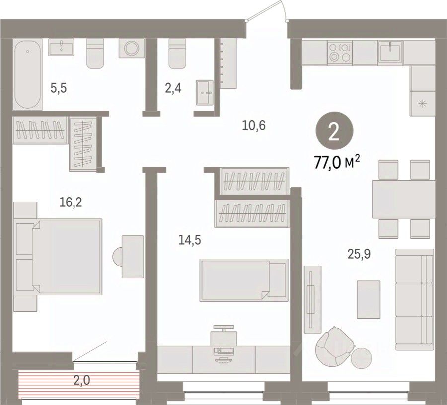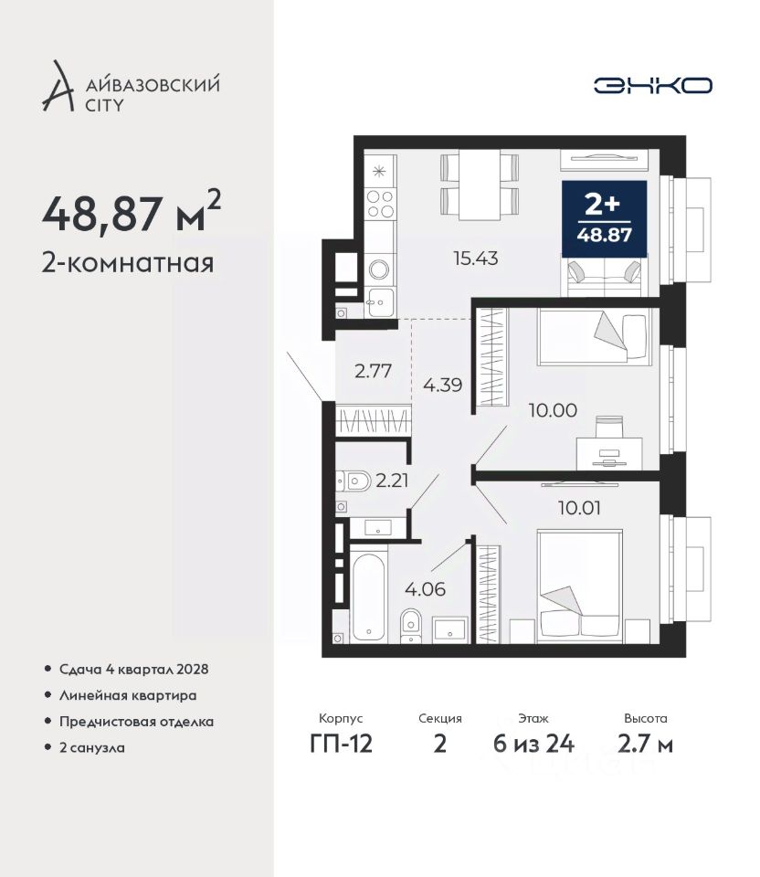 Двухкомнатная квартира с предчистовой отделкой в ЖК ''Айвазовский City'' на 6 этаже. Общая площадь: 48.87 кв.м., жилая: 20.01 кв.м., площадь просторной кухни-столовой: 15.43 кв.м. Комнаты изолированные, все окна выходят на одну сторону. В квартире один совмещенный и один раздельный санузел. Высота потолков 2.7 м. Дом монолитный, многоподъездный, высотой 24 этажа. Квартира находится во 2-й секции в корпусе ГП-12. На этаже 6 квартир. В подъезде 1 пассажирский и 1 грузовой лифт. Окончание строительства - 4 квартал 2028 года. Оформление сделки по договору долевого участия. Новый жилой район располагается в живописном месте на берегу Туры в центральной части города. Принципиально новое пространство для жизни в центре современного города для тех, чьи мечты сбываются, кто нацелен на постоянный рост, перемены к лучшему для себя и своих близких. Каждая деталь Айвазовский City вдохновляет и заряжает на новые свершения: авторская архитектура, сбалансированная продуманная инфраструктура, дизайнерские дворы со спортивными и детскими площадками, парковые зоны с фонтанами, водный канал, украшающий центральный прогулочный маршрут района и многое другое. В 2019 года проект стал лауреатом престижной премии Urban Awards 2019 в номинации ''Лучший строящийся региональный жилой комплекс бизнес-класса''. Главная особенность Айвазовский City - соседство разных архитектурных школ в рамках одного дома. Изысканная классика, выразительная эклектика и оригинальный модерн - жить в одном из таких домов настоящий повод для гордости. Айвазовский City это идеальное сочетание комфорта, технологий и развитой инфраструктуры. Вход в подъезд возможен с улицы и со двора. Отправляясь на работу или за покупками, жители могут выйти с внешней стороны дома, а для прогулки с ребенком со стороны двора. Экологически чистые материалы и энергосберегающие технологии, качественное освещение общественных зон, видеонаблюдение по всей территории жилого района (в том числе в подъездах, лифтах и в подземном паркинге), закрытые дворы с доступом только для жителей Айвазовский City. Часть домов в Айвазовский City будут оснащены подземным паркингом. Востребованный в нашем климатическом поясе формат хранения автомобилей защитит собственность владельца в любое время года. Аккредитация в банках: ОАО ''Альфа-Банк'', ПАО Банк ''ВТБ'', ПАО ''Газпромбанк'', ''Сбербанк России'', АО ''ДОМ.РФ'' и других. #2Mvgce