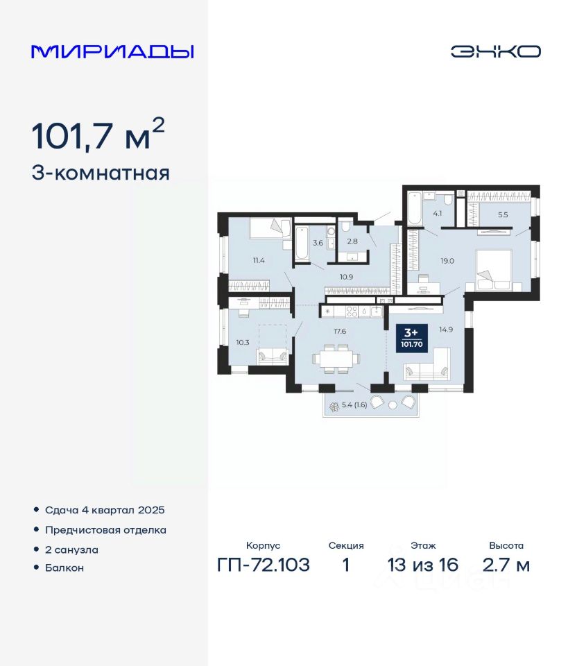 Просторная 3-комн. квартира с предчистовой отделкой в ЖК ''Мириады'' на 13 этаже. Общая площадь: 101.7 кв.м., жилая: 40.7 кв.м., площадь просторной кухни-столовой: 32.5 кв.м. Квартира без проходных комнат, окна выходят нa три cтopoны дома. В квартире один балкон, два совмещенных санузла. Высота потолков 2.7 м. Дом монолитный, трехподъездный, переменной этажности, от 14 до 16 этажей. Квартира находится в 1-й секции высотой 16 этажей в корпусе ГП-72.103. На этаже 8 квартир. В подъезде 1 пассажирский и 1 грузовой лифт. Окончание строительства - 4 квартал 2025 года. Оформление сделки по договору долевого участия. Вселенная бесконечных историй. Ранее невиданный Тюмени масштаб: территория 240 гектаров и 1 650 000 м² застройки. Мириады это город масштабных перемен и больших возможностей. Город зеленых рощ и зеркальных озер. Город для работы, учебы и развлечений. Город для детей и их родителей. Город для всех и каждого. Проект расположен в районе Мыс рядом с ТРЦ ''Тюмень Сити Молл'' в границах улицы Тимофея Чаркова, Тобольского тракта и объездной дороги. Срок полного освоения территории - до 2034 года. #ZmtEV8