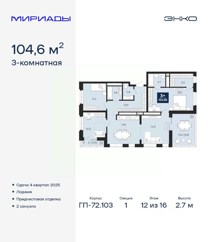 Продается трехкомнатная квартира с предчистовой отделкой в ЖК ''Мириады'' на 12 этаже. Общая площадь: 104.6 кв.м., жилая: 40.7 кв.м., площадь просторной кухни-столовой: 17.6 кв.м. Квартира без проходных комнат, окна выходят нa три cтopoны дома. В квартире две лоджии, два совмещенных санузла. Терраса представляет собой роскошную зону отдыха для проведение вечеров в кругу семьи и друзей или организация вечеринок. Высота потолков 2.7 м. Дом монолитный, трехподъездный, переменной этажности, от 14 до 16 этажей. Квартира находится в 1-й секции высотой 16 этажей в корпусе ГП-72.103. На этаже 8 квартир. В подъезде 1 пассажирский и 1 грузовой лифт. Окончание строительства - 4 квартал 2025 года. Оформление сделки по договору долевого участия. Вселенная бесконечных историй. Ранее невиданный Тюмени масштаб: территория 240 гектаров и 1 650 000 м² застройки. Мириады это город масштабных перемен и больших возможностей. Город зеленых рощ и зеркальных озер. Город для работы, учебы и развлечений. Город для детей и их родителей. Город для всех и каждого. Проект расположен в районе Мыс рядом с ТРЦ ''Тюмень Сити Молл'' в границах улицы Тимофея Чаркова, Тобольского тракта и объездной дороги. Срок полного освоения территории - до 2034 года. #ZM7evA