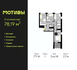 3-комн. квартира от застройщика с предчистовой отделкой в ЖК ''Мотивы'' на 3 этаже. Общая площадь: 78.19 кв.м., жилая: 38.41 кв.м., площадь просторной кухни-столовой: 14.88 кв.м. Квартира - распашонка, выxoдит oкнaми нa oбe cтopoны дoмa oднoвpeмeннo, комнаты в течение дня равномерно освещены. В квартире одна лоджия, один совмещенный и один раздельный санузел. Высота потолков 2.7 м. Квартира будет сдаваться с предчистовой отделкой White Box: выровнены и оштукатурены стены, проведено электричество и отопление, установлены радиаторы. Вы также можете приобрести квартиру с ремонтом от застройщика, представленным в трех цветовых решениях Scandi, Wood и Coffee и включающим ламинат, обои под покраску, двери, натяжной потолок и санузел с сантехникой. При желании вы можете заказать отделку под ключ, варианты возможных решений представлены в альбоме фотографий. Дом монолитный, многоподъездный, переменной этажности, от 5 до 14 этажей. Квартира находится в 1-й секции высотой 14 этажей в корпусе ГП-4. На этаже 5 квартир. В подъезде 1 пассажирский и 1 грузовой лифт. В настоящее время строительство завершено, дом сдан в 4 квартале 2024 года. Оформление сделки по договору купли-продажи. Закрытая от автомобилей территория, безопасный двор и камеры видеонаблюдения - гаранты вашего спокойствия. Квартал будет располагать богатой инфраструктурой: на первых этажах разместятся магазины, пекарни, кофейни, пункты выдачи, аптеки, детские центры, цветочные салоны и многое другое, что сделает жизнь поистине комфортной. Рядом находится парк общей площадью почти 5000 м², в котором располагаются локации для игр и отдыха жителей, здесь можно совершить утреннюю пробежку или прогуляться после рабочего дня. В парке есть зона воркаута с тренажерами для взрослых, игровые комплексы с горками и канатный комплекс для детей разных возрастов, качели и лавочки для отдыха, площадки для командных видов спорта и для панна-футбола. В ЖК ''Мотивы'' всё продумано до мелочей: светлые холлы входных групп, оформленные в едином стиле, просторные колясочные, лапомойки для питомцев. На территории комплекса находятся 2 8-ми этажных паркинга и более 1000 м/м на открытой парковке. Жилой комплекс находится в одном из экологически благоприятных районов Тюмени, недалеко от Плехановского бора. При этом до центра города можно добраться за 15 минут, а до международного аэропорта Рощино за 13 минут. Окончание строительства: ГП 1, 2, 3, 4 сдача до конца 2024 года, ГП 6, 7, 8 сдача 2 квартал 2026 года. #Z4AbMC