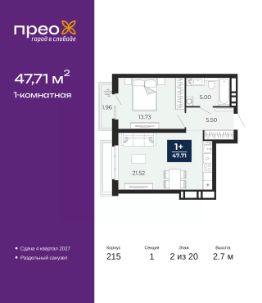 Успейте забронировать по этой цене, срок акции ограничен! Стоимость квартиры указана со скидкой, ваша экономия составит 327,500 руб. Информация по телефону, мы вам все подробно расскажем. Однокомнатная квартира в ЖК ''Прео'' на 2 этаже. Общая площадь: 47.71 кв.м. Высота потолков 2.7 м. Квартира находится в корпусе 215. Дом монолитный, одноподъездный, высотой 20 этажей. На этаже 8 квартир. В подъезде 1 пассажирский и 1 грузовой лифт. Окончание строительства - 4 квартал 2027 года. Оформление сделки по договору долевого участия. Преображенский — один из самых привлекательных районов для жизни! Это полностью самостоятельный жилой район с точки зрения инфраструктуры. Преображенский находится между Московским и Червишевским трактами в квартале улиц Закалужская — Вьюжная — Александра Протозанова. Не нужно ждать, когда появится инфраструктура — переезжайте на всё готовое. Вблизи расположены действующие школа и детский сад. В этом году откроется еще один сад, а в следующем году — школа. По соседству с Преображенским запланировано строительство городского парка ''Комарово'' площадью 38 гектар. За 10 минут можно доехать на автомобиле до крупных ТРЦ: ''Лента'', ''Кристалл'', ''Леруа Мерлен'', ''Метро'' и ''Ашан''. С 2018 года в районе открыт Соседский центр — пространство, созданное для формирования добрососедской среды, совместного досуга, общения и реализации соседских инициатив. Здесь проходят встречи соседей, а также сами жители района организовывают мероприятия. Организатором такого события может стать любой желающий. В квартирах выполнена качественная предчистовая отделка. Гладкие стены с финишным выравниванием по маякам. Ровный потолок для установки натяжного потолка. Установлены пятикамерные окна с двойным стеклопакетом (3 стекла). Дизайнерские холлы с видеонаблюдением, безбарьерным и прозрачным входом всегда светло и спокойно. На первом этаже есть просторные колясочные, где все жители могут оставлять свои коляски и велосипеды. В Преображенском есть всё, что нужно для активного отдыха и занятий спортом. Мы сделали большое футбольное поле с безопасным покрытием. Также установили хоккейный корт, который оборудован по всем необходимым стандартам. Во дворах можно делать упражнения на специальных площадках с турниками. Весь район мы обустроили велодорожками, которые связаны в единый маршрут. У нас есть сухие фонтаны, бьющие из земли, деревья, веревки, сетки, скалодром, газон, песок и резинка — осталось просто дать своему ребенку право на свободную игру. По-настоящему хорошие дворы — это те, которые дети предпочитают соцсетям и телевизору. Аккредитация в банках: ОАО ''Альфа-Банк'', ПАО ''Банк Уралсиб'', ''Сбербанк России'', ПАО ''Газпромбанк'', ПАО Банк ''ВТБ'' и других. #2mdET1