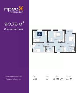 Спешите оформить бронирование по акционной цене, срок акции ограничен! Стоимость квартиры указана со скидкой, ваша экономия составит 500,000 руб. Информация по телефону, мы вам все подробно расскажем. Просторная 3-комн. квартира в ЖК ''Прео'' на 16 этаже. Общая площадь: 90.76 кв.м. Высота потолков 2.7 м. Квартира находится в корпусе 215. Дом монолитный, одноподъездный, высотой 20 этажей. На этаже 8 квартир. В подъезде 1 пассажирский и 1 грузовой лифт. Окончание строительства - 4 квартал 2027 года. Оформление сделки по договору долевого участия. Преображенский — один из самых привлекательных районов для жизни! Это полностью самостоятельный жилой район с точки зрения инфраструктуры. Преображенский находится между Московским и Червишевским трактами в квартале улиц Закалужская — Вьюжная — Александра Протозанова. Не нужно ждать, когда появится инфраструктура — переезжайте на всё готовое. Вблизи расположены действующие школа и детский сад. В этом году откроется еще один сад, а в следующем году — школа. По соседству с Преображенским запланировано строительство городского парка ''Комарово'' площадью 38 гектар. За 10 минут можно доехать на автомобиле до крупных ТРЦ: ''Лента'', ''Кристалл'', ''Леруа Мерлен'', ''Метро'' и ''Ашан''. С 2018 года в районе открыт Соседский центр — пространство, созданное для формирования добрососедской среды, совместного досуга, общения и реализации соседских инициатив. Здесь проходят встречи соседей, а также сами жители района организовывают мероприятия. Организатором такого события может стать любой желающий. В квартирах выполнена качественная предчистовая отделка. Гладкие стены с финишным выравниванием по маякам. Ровный потолок для установки натяжного потолка. Установлены пятикамерные окна с двойным стеклопакетом (3 стекла). Дизайнерские холлы с видеонаблюдением, безбарьерным и прозрачным входом всегда светло и спокойно. На первом этаже есть просторные колясочные, где все жители могут оставлять свои коляски и велосипеды. В Преображенском есть всё, что нужно для активного отдыха и занятий спортом. Мы сделали большое футбольное поле с безопасным покрытием. Также установили хоккейный корт, который оборудован по всем необходимым стандартам. Во дворах можно делать упражнения на специальных площадках с турниками. Весь район мы обустроили велодорожками, которые связаны в единый маршрут. У нас есть сухие фонтаны, бьющие из земли, деревья, веревки, сетки, скалодром, газон, песок и резинка — осталось просто дать своему ребенку право на свободную игру. По-настоящему хорошие дворы — это те, которые дети предпочитают соцсетям и телевизору. Аккредитация в банках: ПАО ''Газпромбанк'', ПАО ''Банк Уралсиб'', ПАО Банк ''ВТБ'', ОАО ''Альфа-Банк'', ''Сбербанк России'' и других. #26EigB