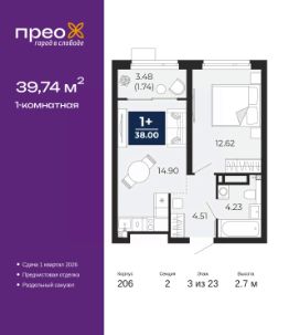 Торопитесь оформить бронирование на этих условиях, предложение ограничено! Стоимость квартиры указана со скидкой, ваша экономия составит 345,303 руб. Информация по телефону, наши менеджеры вам все расскажут. Просторная однокомнатная квартира с предчистовой отделкой в ЖК ''Прео'' на 3 этаже. Общая площадь: 39.74 кв.м. Высота потолков 2.7 м. Дом монолитный, трехподъездный, переменной этажности, от 14 до 23 этажей. Квартира находится во 2-й секции высотой 23 этажа в корпусе 206. На этаже 10 квартир. В подъезде 1 пассажирский и 1 грузовой лифт. Окончание строительства - 1 квартал 2026 года. Оформление сделки по договору долевого участия. Преображенский — один из самых привлекательных районов для жизни! Это полностью самостоятельный жилой район с точки зрения инфраструктуры. Преображенский находится между Московским и Червишевским трактами в квартале улиц Закалужская — Вьюжная — Александра Протозанова. Не нужно ждать, когда появится инфраструктура — переезжайте на всё готовое. Вблизи расположены действующие школа и детский сад. В этом году откроется еще один сад, а в следующем году — школа. По соседству с Преображенским запланировано строительство городского парка ''Комарово'' площадью 38 гектар. За 10 минут можно доехать на автомобиле до крупных ТРЦ: ''Лента'', ''Кристалл'', ''Леруа Мерлен'', ''Метро'' и ''Ашан''. С 2018 года в районе открыт Соседский центр — пространство, созданное для формирования добрососедской среды, совместного досуга, общения и реализации соседских инициатив. Здесь проходят встречи соседей, а также сами жители района организовывают мероприятия. Организатором такого события может стать любой желающий. В квартирах выполнена качественная предчистовая отделка. Гладкие стены с финишным выравниванием по маякам. Ровный потолок для установки натяжного потолка. Установлены пятикамерные окна с двойным стеклопакетом (3 стекла). Дизайнерские холлы с видеонаблюдением, безбарьерным и прозрачным входом всегда светло и спокойно. На первом этаже есть просторные колясочные, где все жители могут оставлять свои коляски и велосипеды. В Преображенском есть всё, что нужно для активного отдыха и занятий спортом. Мы сделали большое футбольное поле с безопасным покрытием. Также установили хоккейный корт, который оборудован по всем необходимым стандартам. Во дворах можно делать упражнения на специальных площадках с турниками. Весь район мы обустроили велодорожками, которые связаны в единый маршрут. У нас есть сухие фонтаны, бьющие из земли, деревья, веревки, сетки, скалодром, газон, песок и резинка — осталось просто дать своему ребенку право на свободную игру. По-настоящему хорошие дворы — это те, которые дети предпочитают соцсетям и телевизору. Аккредитация в банках: ''Сбербанк России'', ПАО ''Газпромбанк'', ПАО ''Банк Уралсиб'', ПАО Банк ''ВТБ'', ОАО ''Альфа-Банк'' и других. #ZMDEFE
