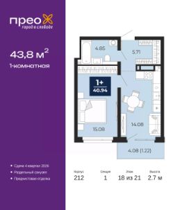 Спешите оформить бронирование, пока действует скидка, предложение ограничено! Стоимость квартиры указана со скидкой, ваша экономия составит 315,500 руб. Информация по телефону, мы вам все подробно расскажем. Просторная 1-комн. квартира с предчистовой отделкой в ЖК ''Прео'' на 18 этаже. Общая площадь: 43.8 кв.м. Высота потолков 2.7 м. Квартира находится в корпусе 212. Дом монолитный, одноподъездный, высотой 21 этаж. На этаже 8 квартир. В подъезде 2 пассажирских и 1 грузовой лифт. Окончание строительства - 4 квартал 2026 года. Оформление сделки по договору долевого участия. Преображенский — один из самых привлекательных районов для жизни! Это полностью самостоятельный жилой район с точки зрения инфраструктуры. Преображенский находится между Московским и Червишевским трактами в квартале улиц Закалужская — Вьюжная — Александра Протозанова. Не нужно ждать, когда появится инфраструктура — переезжайте на всё готовое. Вблизи расположены действующие школа и детский сад. В этом году откроется еще один сад, а в следующем году — школа. По соседству с Преображенским запланировано строительство городского парка ''Комарово'' площадью 38 гектар. За 10 минут можно доехать на автомобиле до крупных ТРЦ: ''Лента'', ''Кристалл'', ''Леруа Мерлен'', ''Метро'' и ''Ашан''. С 2018 года в районе открыт Соседский центр — пространство, созданное для формирования добрососедской среды, совместного досуга, общения и реализации соседских инициатив. Здесь проходят встречи соседей, а также сами жители района организовывают мероприятия. Организатором такого события может стать любой желающий. В квартирах выполнена качественная предчистовая отделка. Гладкие стены с финишным выравниванием по маякам. Ровный потолок для установки натяжного потолка. Установлены пятикамерные окна с двойным стеклопакетом (3 стекла). Дизайнерские холлы с видеонаблюдением, безбарьерным и прозрачным входом всегда светло и спокойно. На первом этаже есть просторные колясочные, где все жители могут оставлять свои коляски и велосипеды. В Преображенском есть всё, что нужно для активного отдыха и занятий спортом. Мы сделали большое футбольное поле с безопасным покрытием. Также установили хоккейный корт, который оборудован по всем необходимым стандартам. Во дворах можно делать упражнения на специальных площадках с турниками. Весь район мы обустроили велодорожками, которые связаны в единый маршрут. У нас есть сухие фонтаны, бьющие из земли, деревья, веревки, сетки, скалодром, газон, песок и резинка — осталось просто дать своему ребенку право на свободную игру. По-настоящему хорошие дворы — это те, которые дети предпочитают соцсетям и телевизору. Аккредитация в банках: ПАО Банк ''ВТБ'', ПАО ''Газпромбанк'', ОАО ''Альфа-Банк'', ''Сбербанк России'', ПАО ''Банк Уралсиб'' и других. #zmdE30