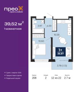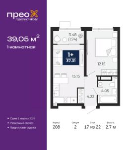 Успейте оформить бронирование по акционной цене, период предложения ограничен! Стоимость квартиры указана со скидкой, ваша экономия составит 339,808 руб. По всем вопросам обращайтесь в офис продаж, мы вам все подробно расскажем. 1-комн. квартира с предчистовой отделкой в ЖК ''Прео'' на 17 этаже. Общая площадь: 39.05 кв.м. Высота потолков 2.7 м. Дом монолитный, трехподъездный, переменной этажности, от 14 до 22 этажей. Квартира находится во 2-й секции высотой 22 этажа в корпусе 208. На этаже 10 квартир. В подъезде 1 пассажирский и 1 грузовой лифт. Окончание строительства - 1 квартал 2026 года. Оформление сделки по договору долевого участия. Преображенский — один из самых привлекательных районов для жизни! Это полностью самостоятельный жилой район с точки зрения инфраструктуры. Преображенский находится между Московским и Червишевским трактами в квартале улиц Закалужская — Вьюжная — Александра Протозанова. Не нужно ждать, когда появится инфраструктура — переезжайте на всё готовое. Вблизи расположены действующие школа и детский сад. В этом году откроется еще один сад, а в следующем году — школа. По соседству с Преображенским запланировано строительство городского парка ''Комарово'' площадью 38 гектар. За 10 минут можно доехать на автомобиле до крупных ТРЦ: ''Лента'', ''Кристалл'', ''Леруа Мерлен'', ''Метро'' и ''Ашан''. С 2018 года в районе открыт Соседский центр — пространство, созданное для формирования добрососедской среды, совместного досуга, общения и реализации соседских инициатив. Здесь проходят встречи соседей, а также сами жители района организовывают мероприятия. Организатором такого события может стать любой желающий. В квартирах выполнена качественная предчистовая отделка. Гладкие стены с финишным выравниванием по маякам. Ровный потолок для установки натяжного потолка. Установлены пятикамерные окна с двойным стеклопакетом (3 стекла). Дизайнерские холлы с видеонаблюдением, безбарьерным и прозрачным входом всегда светло и спокойно. На первом этаже есть просторные колясочные, где все жители могут оставлять свои коляски и велосипеды. В Преображенском есть всё, что нужно для активного отдыха и занятий спортом. Мы сделали большое футбольное поле с безопасным покрытием. Также установили хоккейный корт, который оборудован по всем необходимым стандартам. Во дворах можно делать упражнения на специальных площадках с турниками. Весь район мы обустроили велодорожками, которые связаны в единый маршрут. У нас есть сухие фонтаны, бьющие из земли, деревья, веревки, сетки, скалодром, газон, песок и резинка — осталось просто дать своему ребенку право на свободную игру. По-настоящему хорошие дворы — это те, которые дети предпочитают соцсетям и телевизору. Аккредитация в банках: ПАО ''Газпромбанк'', ОАО ''Альфа-Банк'', ПАО Банк ''ВТБ'', ПАО ''Банк Уралсиб'', ''Сбербанк России'' и других. #2MdEDS
