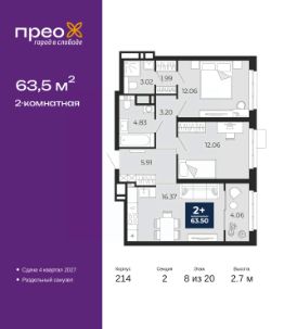 Успейте забронировать на этих условиях, срок предложения ограничен! Стоимость квартиры указана со скидкой, ваша экономия составит 443,500 руб. По всем вопросам звоните в офис продаж, наши менеджеры вам все расскажут. Двухкомнатная квартира в ЖК ''Прео'' на 8 этаже. Общая площадь: 63.5 кв.м. Высота потолков 2.7 м. Дом монолитный, двухподъездный, переменной этажности, от 12 до 20 этажей. Квартира находится во 2-й секции высотой 20 этажей в корпусе 214. На этаже 8 квартир. В подъезде 1 пассажирский и 1 грузовой лифт. Окончание строительства - 4 квартал 2027 года. Оформление сделки по договору долевого участия. Преображенский — один из самых привлекательных районов для жизни! Это полностью самостоятельный жилой район с точки зрения инфраструктуры. Преображенский находится между Московским и Червишевским трактами в квартале улиц Закалужская — Вьюжная — Александра Протозанова. Не нужно ждать, когда появится инфраструктура — переезжайте на всё готовое. Вблизи расположены действующие школа и детский сад. В этом году откроется еще один сад, а в следующем году — школа. По соседству с Преображенским запланировано строительство городского парка ''Комарово'' площадью 38 гектар. За 10 минут можно доехать на автомобиле до крупных ТРЦ: ''Лента'', ''Кристалл'', ''Леруа Мерлен'', ''Метро'' и ''Ашан''. С 2018 года в районе открыт Соседский центр — пространство, созданное для формирования добрососедской среды, совместного досуга, общения и реализации соседских инициатив. Здесь проходят встречи соседей, а также сами жители района организовывают мероприятия. Организатором такого события может стать любой желающий. В квартирах выполнена качественная предчистовая отделка. Гладкие стены с финишным выравниванием по маякам. Ровный потолок для установки натяжного потолка. Установлены пятикамерные окна с двойным стеклопакетом (3 стекла). Дизайнерские холлы с видеонаблюдением, безбарьерным и прозрачным входом всегда светло и спокойно. На первом этаже есть просторные колясочные, где все жители могут оставлять свои коляски и велосипеды. В Преображенском есть всё, что нужно для активного отдыха и занятий спортом. Мы сделали большое футбольное поле с безопасным покрытием. Также установили хоккейный корт, который оборудован по всем необходимым стандартам. Во дворах можно делать упражнения на специальных площадках с турниками. Весь район мы обустроили велодорожками, которые связаны в единый маршрут. У нас есть сухие фонтаны, бьющие из земли, деревья, веревки, сетки, скалодром, газон, песок и резинка — осталось просто дать своему ребенку право на свободную игру. По-настоящему хорошие дворы — это те, которые дети предпочитают соцсетям и телевизору. Аккредитация в банках: ПАО Банк ''ВТБ'', ПАО ''Газпромбанк'', ОАО ''Альфа-Банк'', ПАО ''Банк Уралсиб'', ''Сбербанк России'' и других. #z6Eoa9