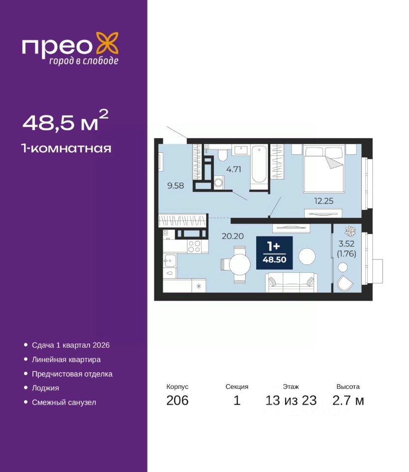 Просторная однокомнатная квартира с предчистовой отделкой в ЖК ''Прео'' на 13 этаже. Общая площадь: 48.5 кв.м., жилая: 12.25 кв.м., площадь просторной кухни-столовой: 20.2 кв.м. Все окна выходят на одну сторону. В квартире одна лоджия, один совмещенный санузел. Высота потолков 2.7 м. Дом монолитный, трехподъездный, переменной этажности, от 14 до 23 этажей. Квартира находится в 1-й секции высотой 23 этажа в корпусе 206. На этаже 8 квартир. В подъезде 1 пассажирский и 1 грузовой лифт. Окончание строительства - 1 квартал 2026 года. Оформление сделки по договору долевого участия. Преображенский — один из самых привлекательных районов для жизни! Это полностью самостоятельный жилой район с точки зрения инфраструктуры. Преображенский находится между Московским и Червишевским трактами в квартале улиц Закалужская — Вьюжная — Александра Протозанова. Не нужно ждать, когда появится инфраструктура — переезжайте на всё готовое. Вблизи расположены действующие школа и детский сад. В этом году откроется еще один сад, а в следующем году — школа. По соседству с Преображенским запланировано строительство городского парка ''Комарово'' площадью 38 гектар. За 10 минут можно доехать на автомобиле до крупных ТРЦ: ''Лента'', ''Кристалл'', ''Леруа Мерлен'', ''Метро'' и ''Ашан''. С 2018 года в районе открыт Соседский центр — пространство, созданное для формирования добрососедской среды, совместного досуга, общения и реализации соседских инициатив. Здесь проходят встречи соседей, а также сами жители района организовывают мероприятия. Организатором такого события может стать любой желающий. В квартирах выполнена качественная предчистовая отделка. Гладкие стены с финишным выравниванием по маякам. Ровный потолок для установки натяжного потолка. Установлены пятикамерные окна с двойным стеклопакетом (3 стекла). Дизайнерские холлы с видеонаблюдением, безбарьерным и прозрачным входом всегда светло и спокойно. На первом этаже есть просторные колясочные, где все жители могут оставлять свои коляски и велосипеды. В Преображенском есть всё, что нужно для активного отдыха и занятий спортом. Мы сделали большое футбольное поле с безопасным покрытием. Также установили хоккейный корт, который оборудован по всем необходимым стандартам. Во дворах можно делать упражнения на специальных площадках с турниками. Весь район мы обустроили велодорожками, которые связаны в единый маршрут. У нас есть сухие фонтаны, бьющие из земли, деревья, веревки, сетки, скалодром, газон, песок и резинка — осталось просто дать своему ребенку право на свободную игру. По-настоящему хорошие дворы — это те, которые дети предпочитают соцсетям и телевизору. Аккредитация в банках: ПАО Банк ''ВТБ'', ПАО ''Банк Уралсиб'', ''Сбербанк России'', ОАО ''Альфа-Банк'', ПАО ''Газпромбанк'' и других. #2WTfFs