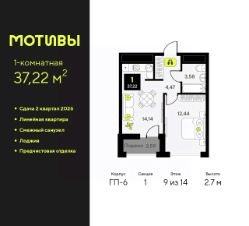 1-комн. квартира с предчистовой отделкой в ЖК ''Мотивы'' на 9 этаже. Общая площадь: 37.22 кв.м., жилая: 12.44 кв.м., площадь просторной кухни-столовой: 14.14 кв.м. Все окна выходят на одну сторону. В квартире одна лоджия, один совмещенный санузел. Высота потолков 2.7 м. Квартира будет сдаваться с предчистовой отделкой White Box: выровнены и оштукатурены стены, проведено электричество и отопление, установлены радиаторы. Вы также можете приобрести квартиру с ремонтом от застройщика, представленным в трех цветовых решениях Scandi, Wood и Coffee и включающим ламинат, обои под покраску, двери, натяжной потолок и санузел с сантехникой. При желании вы можете заказать отделку под ключ, варианты возможных решений представлены в альбоме фотографий. Дом монолитный, черырехподъездный, переменной этажности, от 12 до 14 этажей. Квартира находится в 1-й секции высотой 14 этажей в корпусе ГП-6. На этаже 12 квартир. В подъезде 1 пассажирский и 1 грузовой лифт. Окончание строительства - 2 квартал 2026 года. Оформление сделки по договору долевого участия. Закрытая от автомобилей территория, безопасный двор и камеры видеонаблюдения - гаранты вашего спокойствия. Квартал будет располагать богатой инфраструктурой: на первых этажах разместятся магазины, пекарни, кофейни, пункты выдачи, аптеки, детские центры, цветочные салоны и многое другое, что сделает жизнь поистине комфортной. Рядом находится парк общей площадью почти 5000 м², в котором располагаются локации для игр и отдыха жителей, здесь можно совершить утреннюю пробежку или прогуляться после рабочего дня. В парке есть зона воркаута с тренажерами для взрослых, игровые комплексы с горками и канатный комплекс для детей разных возрастов, качели и лавочки для отдыха, площадки для командных видов спорта и для панна-футбола. В ЖК ''Мотивы'' всё продумано до мелочей: светлые холлы входных групп, оформленные в едином стиле, просторные колясочные, лапомойки для питомцев. На территории комплекса находятся 2 8-ми этажных паркинга и более 1000 м/м на открытой парковке. Жилой комплекс находится в одном из экологически благоприятных районов Тюмени, недалеко от Плехановского бора. При этом до центра города можно добраться за 15 минут, а до международного аэропорта Рощино за 13 минут. Окончание строительства: ГП 1, 2, 3, 4 сдача до конца 2024 года, ГП 6, 7, 8 сдача 2 квартал 2026 года. #2WATfc