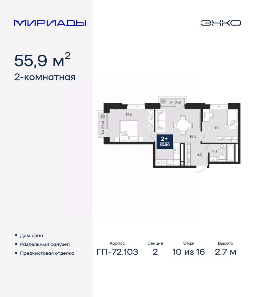 Двухкомнатная квартира с предчистовой отделкой в ЖК ''Мириады'' на 10 этаже. Общая площадь: 55.9 кв.м. Высота потолков 2.7 м. Дом монолитный, трехподъездный, переменной этажности, от 14 до 16 этажей. Квартира находится во 2-й секции высотой 16 этажей в корпусе ГП-72.103. На этаже 6 квартир. В подъезде 1 пассажирский и 1 грузовой лифт. Строительство окончено, дом сдан в 4 квартале 2025 года. Оформление сделки по договору купли-продажи. Вселенная бесконечных историй. Ранее невиданный Тюмени масштаб: территория 240 гектаров и 1 650 000 м² застройки. Мириады это город масштабных перемен и больших возможностей. Город зеленых рощ и зеркальных озер. Город для работы, учебы и развлечений. Город для детей и их родителей. Город для всех и каждого. Проект расположен в районе Мыс рядом с ТРЦ ''Тюмень Сити Молл'' в границах улицы Тимофея Чаркова, Тобольского тракта и объездной дороги. Срок полного освоения территории - до 2034 года. #ZMEMVl
