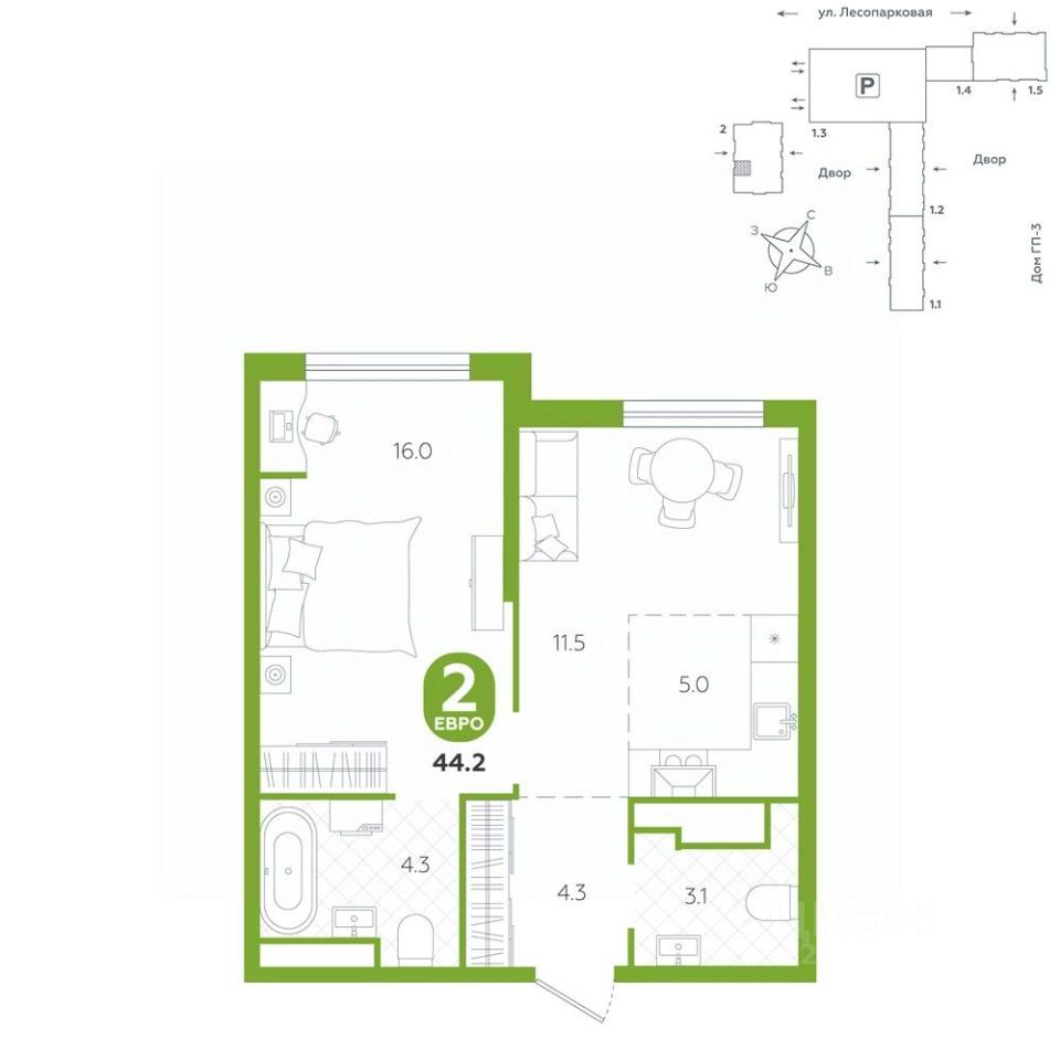 Квартира располагается в ГК ''Чистые Пруды'' от ''Паритет девелопмент''. Это флагманский проект компании в Тюмени. Расположение вдали от шумных улиц и оживленного центра создает ощущение жизни на природе и окружает тишиной и спокойствием. Есть вся необходимая социальная и коммерческая инфраструктура: магазины и сфера услуг на первых этажах. Школы, сады, поликлиника, парки в шаговой доступности. Квартал строится в районе Новой Лесобазы. Рядом выезд на объездную, что существенно экономит время. Поездка до центра города на автомобиле занимает 15-20 минут. Городские кварталы ''Чистые Пруды''сформирован из домов переменной этажности и многоуровневых паркингов. Ввод 1 очереди строительства запланирован на II кв. 2028 года. Всё благоустройство квартала представлено двумя функциональными зонами: приватная внутри дворовая и общественная. Каждый закрытый двор имеет выход на единую променадную зону - бульвар. Концепция благоустройства основана на принципе модульности, что формирует основную идею приватности. Приватность проекта подчеркивает его особенный климат внутри. Модульное благоустройство позволит максимально эффективно использовать пространство двора и удовлетворить потребности различных категорий жителей. В квартирах базово выполнена улучшенная черновая отделка, которая включает в себя: выровненные стены, стяжка пола с шумоизоляцией, горизонтальная разводка отопления, установлены счетчики с телеметрией, окна с 5-камерным профилем и надежные входные двери. При желании можно добавить ремонт от застройщика и включить его в стоимость ипотеки, что позволит сэкономить на стройматериалах и переехать сразу после получения ключей. Характеристики квартиры: этаж - 21 количество комнат - 2 номер помещения - 202 площадь квартиры - 44,2 кв.м Гармоничные пропорции и большие окна наполняют пространство светом, создавая уютную атмосферу. Умное зонирование позволяет удобно организовать как рабочую, так и жилую зоны, что особенно важно для современных жителей. Санузел спроектирован с учетом всех потребностей: здесь есть ванна и место для стиральной машины. Каждый метр квартиры используется с максимальной эффективностью, что делает эту планировку отличным выбором для тех, кто ценит комфорт и удобство.