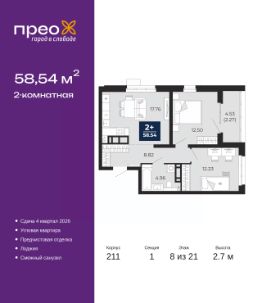 Успейте оформить бронирование по акционной цене! Предложение ограничено! Стоимость квартиры указана со скидкой, ваша экономия составит 411,800 RUB. Звоните, мы вам все подробно расскажем! Просторная двухкомнатная квартира с предчистовой отделкой в ЖК ''Прео'' на 12 этаже. Общая площадь: 58.54 кв.м., жилая: 24.73 кв.м., площадь просторной кухни-столовой: 17.76 кв.м. Угловая квартира, идеально подойдет любителям тишины и панорамных видов. В квартире одна лоджия, один совмещенный санузел. Высота потолков 2.7 м. Дом монолитный, черырехподъездный, переменной этажности, от 14 до 21 этажей. Квартира находится в 1-й секции высотой 21 этаж в корпусе 211. На этаже 8 квартир. В подъезде 1 пассажирский и 1 грузовой лифт. Окончание строительства - 4 квартал 2026 года. Оформление сделки по договору долевого участия. Преображенский — один из самых привлекательных районов для жизни! Это полностью самостоятельный жилой район с точки зрения инфраструктуры. Преображенский находится между Московским и Червишевским трактами в квартале улиц Закалужская — Вьюжная — Александра Протозанова. Не нужно ждать, когда появится инфраструктура — переезжайте на всё готовое. Вблизи расположены действующие школа и детский сад. В этом году откроется еще один сад, а в следующем году — школа. По соседству с Преображенским запланировано строительство городского парка ''Комарово'' площадью 38 гектар. За 10 минут можно доехать на автомобиле до крупных ТРЦ: ''Лента'', ''Кристалл'', ''Леруа Мерлен'', ''Метро'' и ''Ашан''. С 2018 года в районе открыт Соседский центр — пространство, созданное для формирования добрососедской среды, совместного досуга, общения и реализации соседских инициатив. Здесь проходят встречи соседей, а также сами жители района организовывают мероприятия. Организатором такого события может стать любой желающий. В квартирах выполнена качественная предчистовая отделка. Гладкие стены с финишным выравниванием по маякам. Ровный потолок для установки натяжного потолка. Установлены пятикамерные окна с двойным стеклопакетом (3 стекла). Дизайнерские холлы с видеонаблюдением, безбарьерным и прозрачным входом всегда светло и спокойно. На первом этаже есть просторные колясочные, где все жители могут оставлять свои коляски и велосипеды. В Преображенском есть всё, что нужно для активного отдыха и занятий спортом. Мы сделали большое футбольное поле с безопасным покрытием. Также установили хоккейный корт, который оборудован по всем необходимым стандартам. Во дворах можно делать упражнения на специальных площадках с турниками. Весь район мы обустроили велодорожками, которые связаны в единый маршрут. У нас есть сухие фонтаны, бьющие из земли, деревья, веревки, сетки, скалодром, газон, песок и резинка — осталось просто дать своему ребенку право на свободную игру. По-настоящему хорошие дворы — это те, которые дети предпочитают соцсетям и телевизору. Аккредитация в банках: ОАО ''Альфа-Банк'', ПАО ''Газпромбанк'', ''Сбербанк России'', ПАО ''Банк Уралсиб'', ПАО Банк ''ВТБ'' и други