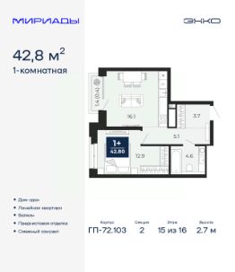 Успейте забронировать, пока действует скидка! Срок предложения ограничен! Стоимость квартиры указана со скидкой, ваша экономия составит 339,091 RUB. По всем вопросам звоните в офис продаж, наши менеджеры вам все расскажут! Продается 1-комн. квартира от застройщика с предчистовой отделкой в ЖК ''Мириады'' на 13 этаже. Общая площадь: 42.8 кв.м., жилая: 12.9 кв.м., площадь просторной кухни-столовой: 16.1 кв.м. Все окна выходят на одну сторону. В квартире один балкон, один совмещенный санузел. Высота потолков 2.7 м. Дом монолитный, трехподъездный, переменной этажности, от 14 до 16 этажей. Квартира находится во 2-й секции высотой 16 этажей в корпусе ГП-72.103. На этаже 6 квартир. В подъезде 1 пассажирский и 1 грузовой лифт. На сегодняшний день строительство окончено, дом сдан в 4 квартале 2025 года. Оформление сделки по договору купли-продажи. Вселенная бесконечных историй. Ранее невиданный Тюмени масштаб: территория 240 гектаров и 1 650 000 м² застройки. Мириады это город масштабных перемен и больших возможностей. Город зеленых рощ и зеркальных озер. Город для работы, учебы и развлечений. Город для детей и их родителей. Город для всех и каждого. Проект расположен в районе Мыс рядом с ТРЦ ''Тюмень Сити Молл'' в границах улицы Тимофея Чаркова, Тобольского тракта и объездной дороги. Срок полного освоения территории - до 2034 года. #2M7DFC