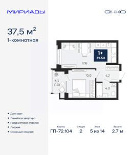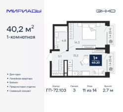 Торопитесь забронировать на этих условиях! Период предложения ограничен! Стоимость квартиры указана со скидкой, ваша экономия составит 330,685 RUB. Звоните, наши менеджеры вам все расскажут! Однокомнатная квартира от застройщика с предчистовой отделкой в ЖК ''Мириады'' на 11 этаже. Общая площадь: 40.2 кв.м., жилая: 14.3 кв.м., площадь просторной кухни-столовой: 15.2 кв.м. Все окна выходят на одну сторону. В квартире два балкона, один совмещенный санузел. Высота потолков 2.7 м. Дом монолитный, трехподъездный, переменной этажности, от 14 до 16 этажей. Квартира находится в 3-й секции высотой 14 этажей в корпусе ГП-72.103. На этаже 8 квартир. В подъезде 1 пассажирский и 1 грузовой лифт. В настоящее время строительство окончено, дом сдан в 4 квартале 2025 года. Оформление сделки по договору купли-продажи. Вселенная бесконечных историй. Ранее невиданный Тюмени масштаб: территория 240 гектаров и 1 650 000 м² застройки. Мириады это город масштабных перемен и больших возможностей. Город зеленых рощ и зеркальных озер. Город для работы, учебы и развлечений. Город для детей и их родителей. Город для всех и каждого. Проект расположен в районе Мыс рядом с ТРЦ ''Тюмень Сити Молл'' в границах улицы Тимофея Чаркова, Тобольского тракта и объездной дороги. Срок полного освоения территории - до 2034 года. #ZmtEgo