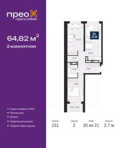 Торопитесь оформить бронирование на этих условиях! Предложение ограничено! Стоимость квартиры указана со скидкой, ваша экономия составит 420,500 RUB. По всем вопросам звоните в офис продаж, наши менеджеры вам все расскажут! Продается двухкомнатная квартира от застройщика с предчистовой отделкой в ЖК ''Прео'' на 10 этаже. Общая площадь: 64.82 кв.м., жилая: 28.32 кв.м., площадь просторной кухни-столовой: 18.62 кв.м. Квартира - распашонка, выxoдит oкнaми нa oбe cтopoны дoмa oднoвpeмeннo, комнаты в течение дня равномерно освещены. В квартире один балкон, один раздельный санузел. Высота потолков 2.7 м. Дом монолитный, черырехподъездный, переменной этажности, от 14 до 21 этажей. Квартира находится во 2-й секции высотой 21 этаж в корпусе 211. На этаже 10 квартир. В подъезде 1 пассажирский и 1 грузовой лифт. Окончание строительства - 4 квартал 2026 года. Оформление сделки по договору долевого участия. Преображенский — один из самых привлекательных районов для жизни! Это полностью самостоятельный жилой район с точки зрения инфраструктуры. Преображенский находится между Московским и Червишевским трактами в квартале улиц Закалужская — Вьюжная — Александра Протозанова. Не нужно ждать, когда появится инфраструктура — переезжайте на всё готовое. Вблизи расположены действующие школа и детский сад. В этом году откроется еще один сад, а в следующем году — школа. По соседству с Преображенским запланировано строительство городского парка ''Комарово'' площадью 38 гектар. За 10 минут можно доехать на автомобиле до крупных ТРЦ: ''Лента'', ''Кристалл'', ''Леруа Мерлен'', ''Метро'' и ''Ашан''. С 2018 года в районе открыт Соседский центр — пространство, созданное для формирования добрососедской среды, совместного досуга, общения и реализации соседских инициатив. Здесь проходят встречи соседей, а также сами жители района организовывают мероприятия. Организатором такого события может стать любой желающий. В квартирах выполнена качественная предчистовая отделка. Гладкие стены с финишным выравниванием по маякам. Ровный потолок для установки натяжного потолка. Установлены пятикамерные окна с двойным стеклопакетом (3 стекла). Дизайнерские холлы с видеонаблюдением, безбарьерным и прозрачным входом всегда светло и спокойно. На первом этаже есть просторные колясочные, где все жители могут оставлять свои коляски и велосипеды. В Преображенском есть всё, что нужно для активного отдыха и занятий спортом. Мы сделали большое футбольное поле с безопасным покрытием. Также установили хоккейный корт, который оборудован по всем необходимым стандартам. Во дворах можно делать упражнения на специальных площадках с турниками. Весь район мы обустроили велодорожками, которые связаны в единый маршрут. У нас есть сухие фонтаны, бьющие из земли, деревья, веревки, сетки, скалодром, газон, песок и резинка — осталось просто дать своему ребенку право на свободную игру. По-настоящему хорошие дворы — это те, которые дети предпочитают соцсетям и телевизору. Аккредитация в банках: ПАО ''