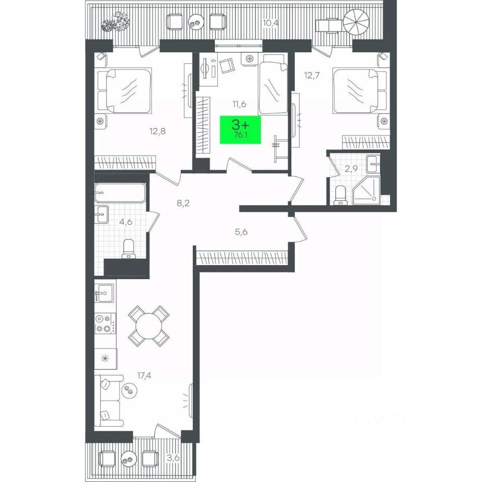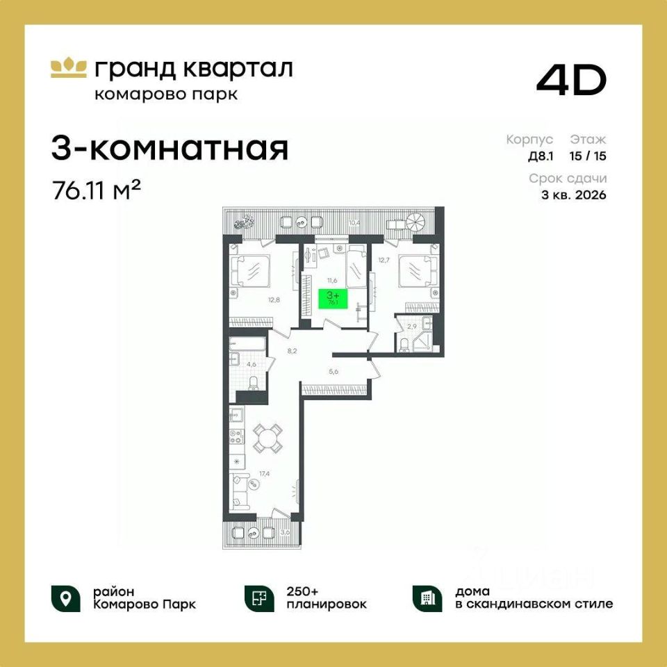 Квартира 3+ с террасой на последнем этаже, мастер-спальней и лоджией в кухне-гостиной. Выходы на террасу спроектированы из двух спален. В родительской спальне спроектирована отдельная ванная комната. Лоджия с выходом на кухню-гостиную можно организовать как общее пространство для чаепитий, дополнительную лоджию можно использовать как зону для отдыха и хобби ваших близких. При входе в квартиру предусмотрена большая ниша под хранение вещей. Гранд Квартал, 2-Д8.1, 15, 4, квартира 73