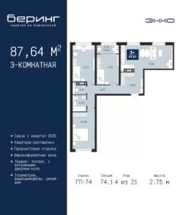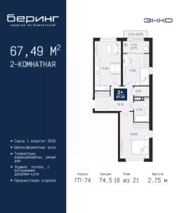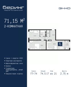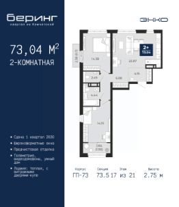 Двухкомнатная квартира с предчистовой отделкой в ЖК ''Беринг'' на 2 этаже. Общая площадь: 54.7 кв.м., жилая: 23.44 кв.м., площадь просторной кухни-столовой: 13.03 кв.м. Комнаты изолированные, все окна выходят на одну сторону. В квартире один балкон, один совмещенный санузел. Высота потолков 2.72 м. Дом монолитный, многоподъездный, переменной этажности, от 17 до 24 этажей. Квартира находится в 4-й секции высотой 19 этажей в корпусе ГП-75. На этаже 4 квартиры. В подъезде 2 пассажирских и 1 грузовой лифт. Окончание строительства - 4 квартал 2027 года. Оформление сделки по договору долевого участия. Подобно знаменитому исследователю, мы чувствуем себя первооткрывателями этой локации. Хотим показать новую суть места, сформировать для вас жизненный опыт, которого ещё не было. Беринг — район зелёного цвета. Беринг — район, который откроется вам с другой стороны. Впечатлит новым уровнем комфорта и качеством жизни. Беринг — открытие на карте города. Первый квартал расположен в районе Тура, в границах улиц: Камчатская Западносибирская Энтузиастов. Вокруг уже есть всё для того, чтобы ежедневная рутина была лишь частью жизни и не доставляла дискомфорта.Школы и детские сады, магазины и аптеки, поликлиника, места для семейного отдыха, пеших и велопрогулок, и даже рыбалки. Масштабное озеленение дворов — визитная карточка ЭНКО и ваш оазис спокойствия, чтобы отвлечься от повседневности. Раскидистые деревья, кустарники, травы и цветы — осталось остановиться, вдохнуть и расслабиться, глядя на эту природную красоту. Стилистика подъездов продолжает концепцию Беринга, вдохновлённого Камчаткой: сдержанный,но при этом впечатляющий дизайн соседствует с удобством и функциональностью. #zM9gTb