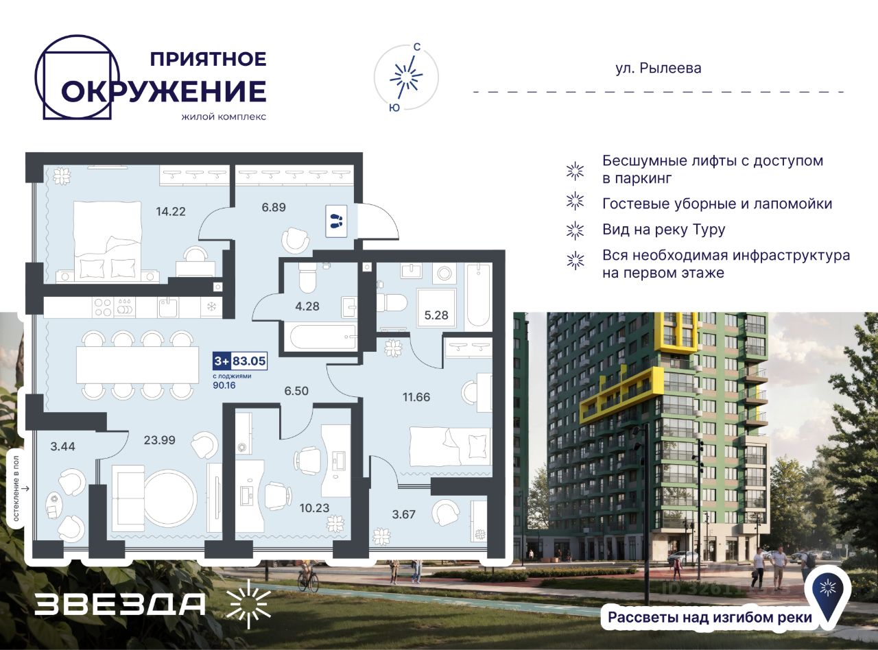 ЖК ''Приятное окружение'' комфорт-класса сочетает лаконичную архитектуру, продуманное благоустройство и эргономичные планировки. Двухсекционный дом с переменной этажностью расположен в уникальном месте: с одной стороны — дамба, с другой — зелёные массивы. Важно, что на стороне дамбы не предусмотрено строительство новых домов, а значит, из окон комплекса всегда будут открываться живописные виды на природный ландшафт. Есть квартиры с панорамными окнами и видами на набережную и мост Влюбленных. А в праздничные дни можно любоваться фейерверками, не выходя из дома.