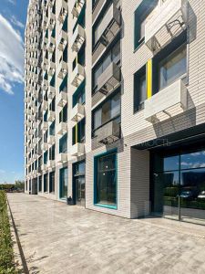 19-этажная архитектурная доминанта с эффектом паруса и камерная секция: французские балконы, сити-хаусы на 1-м этаже, 9 этажей в доме. Уступчатая структура формирует динамичный силуэт — новый акцент ул. Полевая. Металлические балконы создают градиент от тёмного к светлому, большие окна — панорамные виды на город.