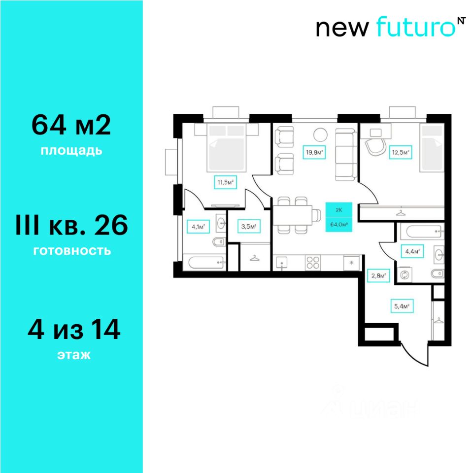 64 м² · Этаж 4 из 14