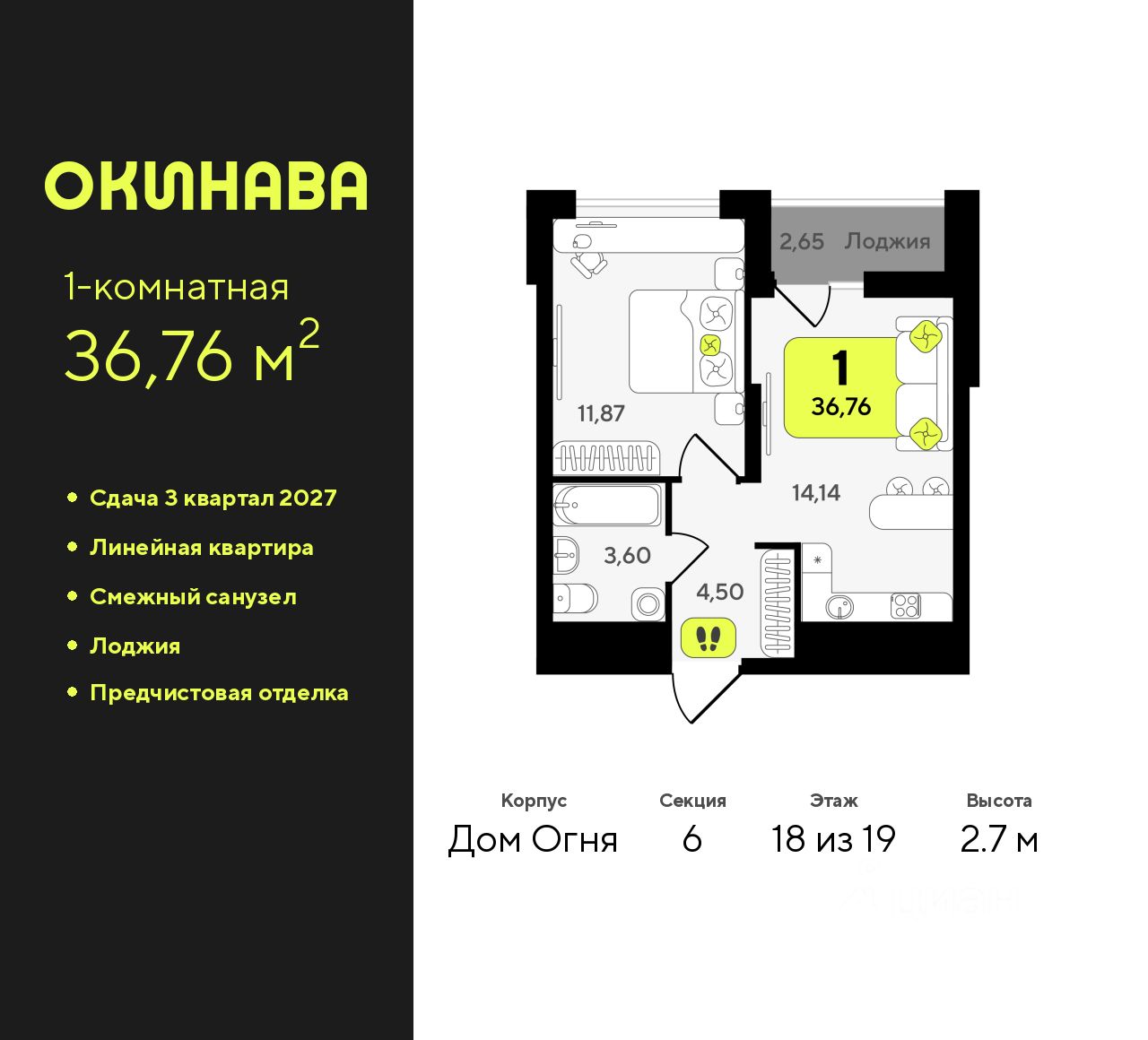 Продается однокомнатная квартира от застройщика с предчистовой отделкой в ЖК ''Окинава'' на 18 этаже. Общая площадь: 36.76 кв.м., жилая: 11.87 кв.м., площадь просторной кухни-столовой: 14.14 кв.м. Все окна выходят на одну сторону. В квартире одна лоджия, один совмещенный санузел. Высота потолков 2.7 м. Квартира будет сдана с предчистовой отделкой: на полах стяжка под финишное покрытие, стены подготовлены под покраску или оклейку обоями, разведена вся электрика с подготовкой для установки выключателей и освещения. При желании вы можете заказать отделку под ключ, варианты возможных решений представлены в альбоме фотографий. Дом монолитный, многоподъездный, переменной этажности, от 13 до 19 этажей. Квартира находится в 6-й секции высотой 19 этажей в корпусе Дом Огня. На этаже 12 квартир. В подъезде 2 пассажирских и 1 грузовой лифт. Окончание строительства - 3 квартал 2027 года. Оформление сделки по договору долевого участия. ЖК ''Окинава'' это не просто жилой комплекс, это остров 4 стихий. Они отражаются во внешнем виде фасадов домов, обустройстве дворов и внутреннем оформлении холлов. Каждая из стихий это отдельный дом. Между домами раскинется большой двухуровневый пешеходный бульвар. Первый уровень прогулочный с местами для отдыха, амфитеатром и фонтанами. На втором уровне расположатся площадки для детей, спортивных игр и тренировок. Квартал будет располагать богатой инфраструктурой: на первых этажах разместятся магазины, пекарни, кофейни, пункты выдачи, аптеки, детские центры, цветочные салоны и многое другое, что сделает жизнь поистине комфортной. В жилом комплексе есть кладовые, а также несколько видов паркинга: уличный гостевой, закрытый теплый и паркинг в стилобате, попасть в который можно на лифте с любого жилого этажа. Дворы в каждом доме отражают его стихию, отличаясь по наполнению. Они дополняют друг друга, образуя единое дворовое пространство жилого комплекса. Закрытая территория, свободная от автомобилей, обеспечит безопасность и спокойный отдых. Холлы оформлены керамогранитом, зеркалами и разноуровневым освещением. Витражные входные группы, мягкие зоны ожидания, видеонаблюдение 24/7, вместительные колясочные и даже лапомойки для питомцев всё это будет в ЖК ''Окинава''. Жилой комплекс ''Окинава'' находится в активно развивающемся V заречном микрорайоне, недалеко от озера Алебашево, где в будущем расположится масштабный ивент-парк с зонами отдыха. Удобная транспортная развязка позволит добраться до центра всего за 15 минут. #2WE20M