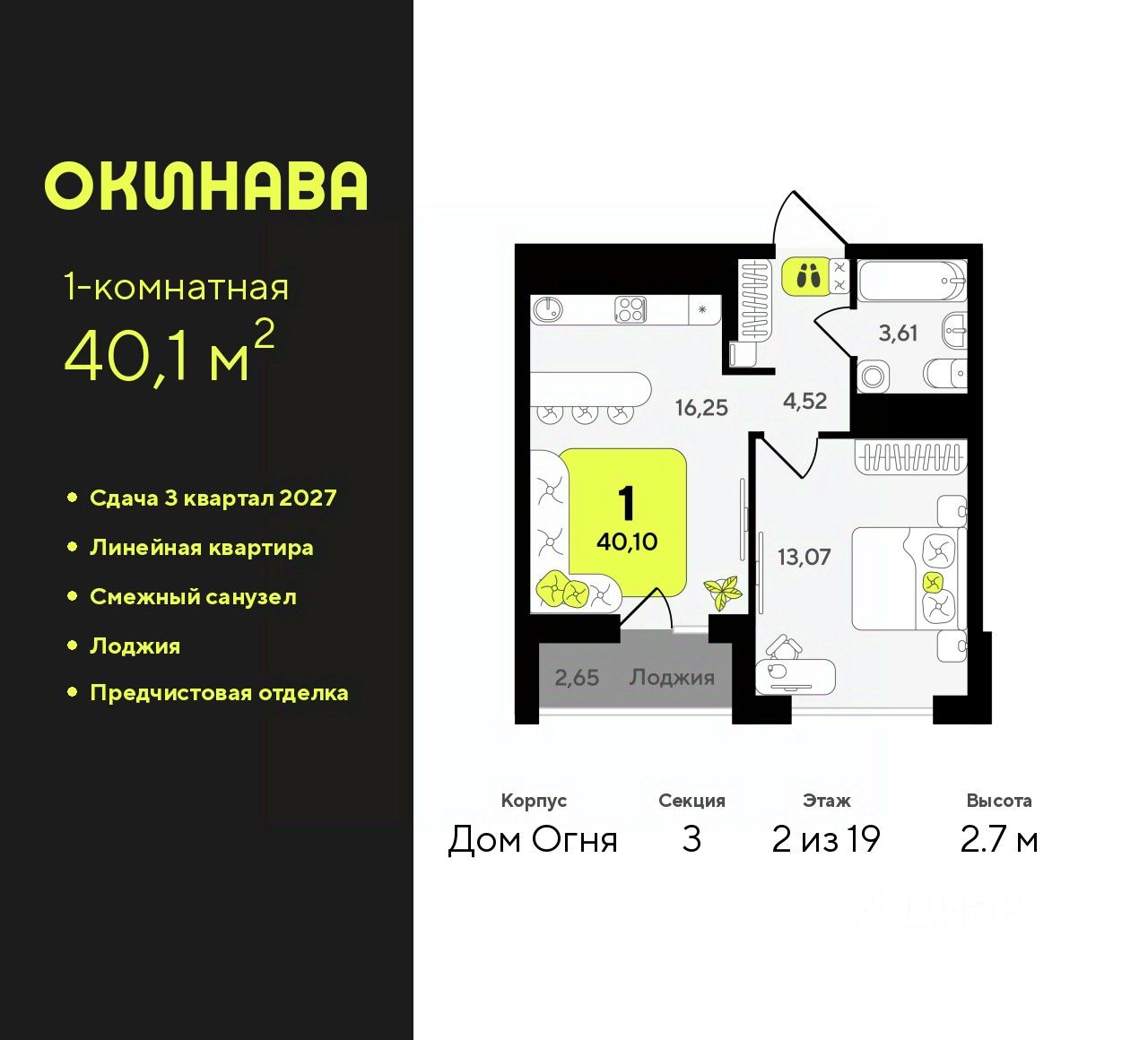 1-комн. квартира от застройщика с предчистовой отделкой в ЖК ''Окинава'' на 2 этаже. Общая площадь: 40.1 кв.м., жилая: 13.07 кв.м., площадь просторной кухни-столовой: 16.25 кв.м. Все окна выходят на одну сторону. В квартире одна лоджия, один совмещенный санузел. Высота потолков 2.7 м. Квартира будет сдана с предчистовой отделкой: на полах стяжка под финишное покрытие, стены подготовлены под покраску или оклейку обоями, разведена вся электрика с подготовкой для установки выключателей и освещения. При желании вы можете заказать отделку под ключ, варианты возможных решений представлены в альбоме фотографий. Дом монолитный, многоподъездный, переменной этажности, от 13 до 19 этажей. Квартира находится в 3-й секции высотой 19 этажей в корпусе Дом Огня. На этаже 11 квартир. В подъезде 1 пассажирский и 1 грузовой лифт. Окончание строительства - 3 квартал 2027 года. Оформление сделки по договору долевого участия. ЖК ''Окинава'' это не просто жилой комплекс, это остров 4 стихий. Они отражаются во внешнем виде фасадов домов, обустройстве дворов и внутреннем оформлении холлов. Каждая из стихий это отдельный дом. Между домами раскинется большой двухуровневый пешеходный бульвар. Первый уровень прогулочный с местами для отдыха, амфитеатром и фонтанами. На втором уровне расположатся площадки для детей, спортивных игр и тренировок. Квартал будет располагать богатой инфраструктурой: на первых этажах разместятся магазины, пекарни, кофейни, пункты выдачи, аптеки, детские центры, цветочные салоны и многое другое, что сделает жизнь поистине комфортной. В жилом комплексе есть кладовые, а также несколько видов паркинга: уличный гостевой, закрытый теплый и паркинг в стилобате, попасть в который можно на лифте с любого жилого этажа. Дворы в каждом доме отражают его стихию, отличаясь по наполнению. Они дополняют друг друга, образуя единое дворовое пространство жилого комплекса. Закрытая территория, свободная от автомобилей, обеспечит безопасность и спокойный отдых. Холлы оформлены керамогранитом, зеркалами и разноуровневым освещением. Витражные входные группы, мягкие зоны ожидания, видеонаблюдение 24/7, вместительные колясочные и даже лапомойки для питомцев всё это будет в ЖК ''Окинава''. Жилой комплекс ''Окинава'' находится в активно развивающемся V заречном микрорайоне, недалеко от озера Алебашево, где в будущем расположится масштабный ивент-парк с зонами отдыха. Удобная транспортная развязка позволит добраться до центра всего за 15 минут. #24EzaA