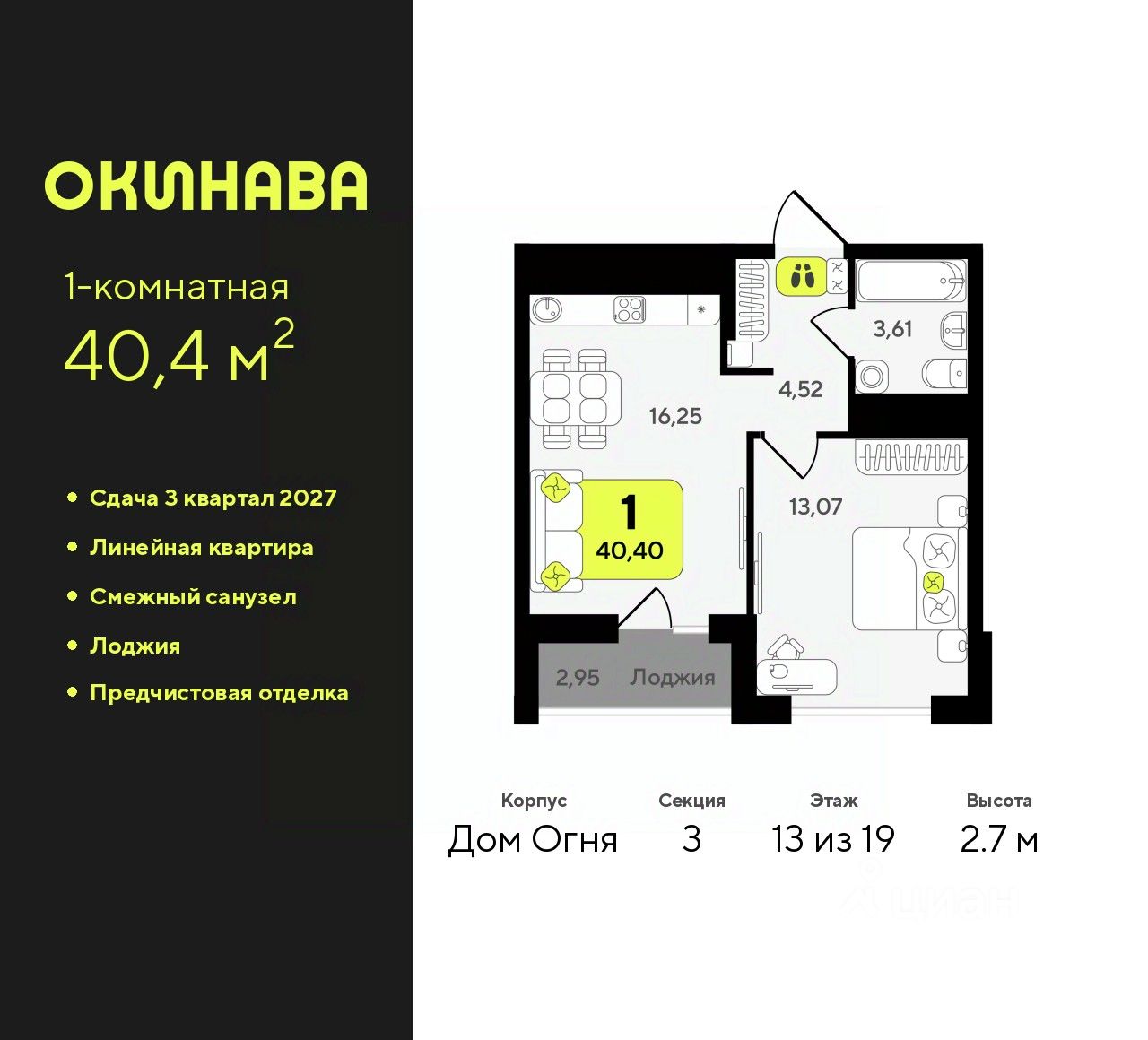 1-комн. квартира с предчистовой отделкой в ЖК ''Окинава'' на 13 этаже. Общая площадь: 40.4 кв.м., жилая: 13.07 кв.м., площадь просторной кухни-столовой: 16.25 кв.м. Все окна выходят на одну сторону. В квартире одна лоджия, один совмещенный санузел. Высота потолков 2.7 м. Квартира будет сдана с предчистовой отделкой: на полах стяжка под финишное покрытие, стены подготовлены под покраску или оклейку обоями, разведена вся электрика с подготовкой для установки выключателей и освещения. При желании вы можете заказать отделку под ключ, варианты возможных решений представлены в альбоме фотографий. Дом монолитный, многоподъездный, переменной этажности, от 13 до 19 этажей. Квартира находится в 3-й секции высотой 19 этажей в корпусе Дом Огня. На этаже 11 квартир. В подъезде 1 пассажирский и 1 грузовой лифт. Окончание строительства - 3 квартал 2027 года. Оформление сделки по договору долевого участия. ЖК ''Окинава'' это не просто жилой комплекс, это остров 4 стихий. Они отражаются во внешнем виде фасадов домов, обустройстве дворов и внутреннем оформлении холлов. Каждая из стихий это отдельный дом. Между домами раскинется большой двухуровневый пешеходный бульвар. Первый уровень прогулочный с местами для отдыха, амфитеатром и фонтанами. На втором уровне расположатся площадки для детей, спортивных игр и тренировок. Квартал будет располагать богатой инфраструктурой: на первых этажах разместятся магазины, пекарни, кофейни, пункты выдачи, аптеки, детские центры, цветочные салоны и многое другое, что сделает жизнь поистине комфортной. В жилом комплексе есть кладовые, а также несколько видов паркинга: уличный гостевой, закрытый теплый и паркинг в стилобате, попасть в который можно на лифте с любого жилого этажа. Дворы в каждом доме отражают его стихию, отличаясь по наполнению. Они дополняют друг друга, образуя единое дворовое пространство жилого комплекса. Закрытая территория, свободная от автомобилей, обеспечит безопасность и спокойный отдых. Холлы оформлены керамогранитом, зеркалами и разноуровневым освещением. Витражные входные группы, мягкие зоны ожидания, видеонаблюдение 24/7, вместительные колясочные и даже лапомойки для питомцев всё это будет в ЖК ''Окинава''. Жилой комплекс ''Окинава'' находится в активно развивающемся V заречном микрорайоне, недалеко от озера Алебашево, где в будущем расположится масштабный ивент-парк с зонами отдыха. Удобная транспортная развязка позволит добраться до центра всего за 15 минут. #z4EZDs