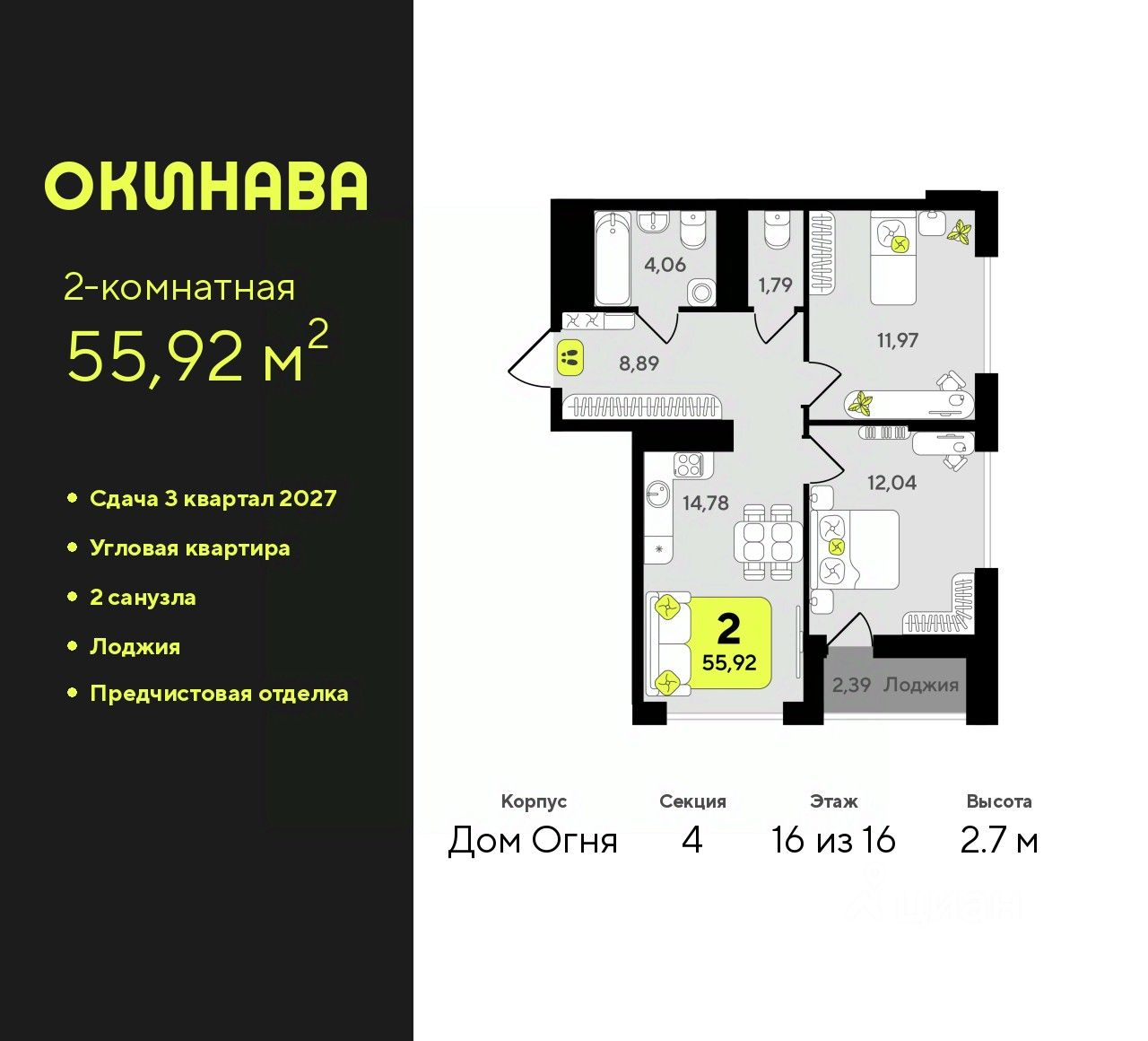 2-комн. квартира от застройщика с предчистовой отделкой в ЖК ''Окинава'' на 16 этаже. Общая площадь: 55.92 кв.м., жилая: 24.01 кв.м., площадь просторной кухни-столовой: 14.78 кв.м. Квартира угловая, очень светлая, естественная вентиляция при открытии окон. В квартире одна лоджия, один совмещенный и один раздельный санузел. Высота потолков 2.7 м. Квартира будет сдана с предчистовой отделкой: на полах стяжка под финишное покрытие, стены подготовлены под покраску или оклейку обоями, разведена вся электрика с подготовкой для установки выключателей и освещения. При желании вы можете заказать отделку под ключ, варианты возможных решений представлены в альбоме фотографий. Дом монолитный, многоподъездный, переменной этажности, от 13 до 19 этажей. Квартира находится в 4-й секции высотой 16 этажей в корпусе Дом Огня. На этаже 6 квартир. В подъезде 1 пассажирский и 1 грузовой лифт. Окончание строительства - 3 квартал 2027 года. Оформление сделки по договору долевого участия. ЖК ''Окинава'' это не просто жилой комплекс, это остров 4 стихий. Они отражаются во внешнем виде фасадов домов, обустройстве дворов и внутреннем оформлении холлов. Каждая из стихий это отдельный дом. Между домами раскинется большой двухуровневый пешеходный бульвар. Первый уровень прогулочный с местами для отдыха, амфитеатром и фонтанами. На втором уровне расположатся площадки для детей, спортивных игр и тренировок. Квартал будет располагать богатой инфраструктурой: на первых этажах разместятся магазины, пекарни, кофейни, пункты выдачи, аптеки, детские центры, цветочные салоны и многое другое, что сделает жизнь поистине комфортной. В жилом комплексе есть кладовые, а также несколько видов паркинга: уличный гостевой, закрытый теплый и паркинг в стилобате, попасть в который можно на лифте с любого жилого этажа. Дворы в каждом доме отражают его стихию, отличаясь по наполнению. Они дополняют друг друга, образуя единое дворовое пространство жилого комплекса. Закрытая территория, свободная от автомобилей, обеспечит безопасность и спокойный отдых. Холлы оформлены керамогранитом, зеркалами и разноуровневым освещением. Витражные входные группы, мягкие зоны ожидания, видеонаблюдение 24/7, вместительные колясочные и даже лапомойки для питомцев всё это будет в ЖК ''Окинава''. Жилой комплекс ''Окинава'' находится в активно развивающемся V заречном микрорайоне, недалеко от озера Алебашево, где в будущем расположится масштабный ивент-парк с зонами отдыха. Удобная транспортная развязка позволит добраться до центра всего за 15 минут. #ZWEgE1