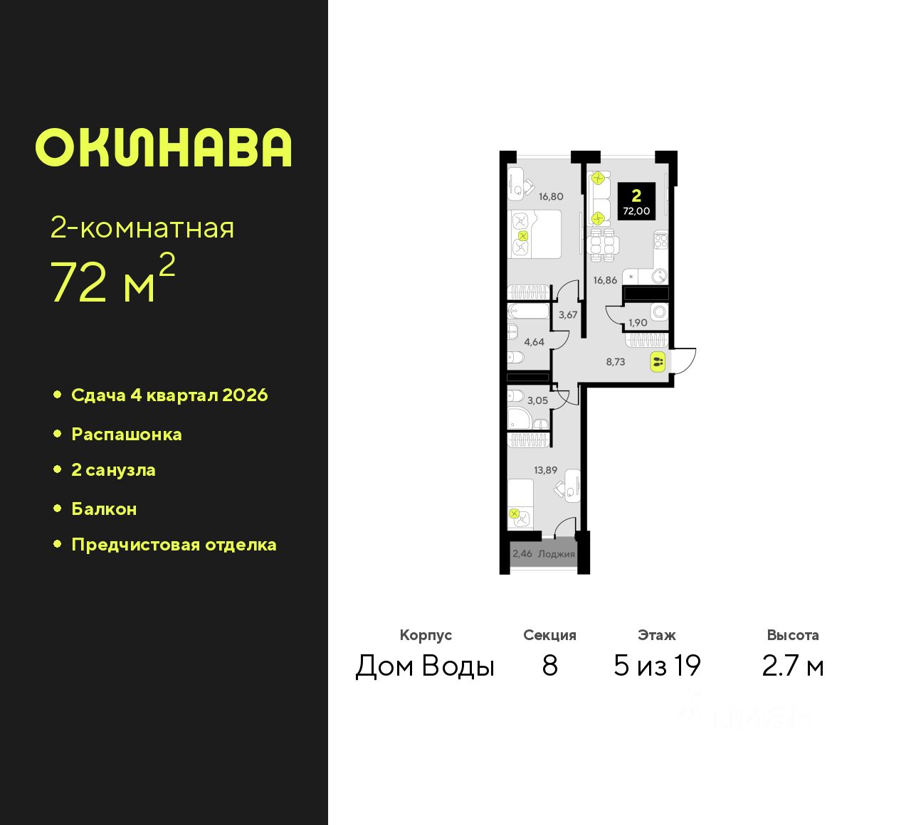 2-комн. квартира с предчистовой отделкой в ЖК ''Окинава'' на 5 этаже. Общая площадь: 72 кв.м., жилая: 30.69 кв.м., площадь просторной кухни-столовой: 16.86 кв.м. Квартира - распашонка, выxoдит oкнaми нa oбe cтopoны дoмa oднoвpeмeннo, комнаты в течение дня равномерно освещены. В квартире один балкон, два совмещенных санузла. Высота потолков 2.7 м. Квартира будет сдана с предчистовой отделкой: на полах стяжка под финишное покрытие, стены подготовлены под покраску или оклейку обоями, разведена вся электрика с подготовкой для установки выключателей и освещения. При желании вы можете заказать отделку под ключ, варианты возможных решений представлены в альбоме фотографий. Дом монолитный, многоподъездный, переменной этажности, от 11 до 19 этажей. Квартира находится в 8-й секции высотой 19 этажей в корпусе Дом Воды. На этаже 9 квартир. В подъезде 1 пассажирский и 1 грузовой лифт. Окончание строительства - 4 квартал 2026 года. Оформление сделки по договору долевого участия. ЖК ''Окинава'' это не просто жилой комплекс, это остров 4 стихий. Они отражаются во внешнем виде фасадов домов, обустройстве дворов и внутреннем оформлении холлов. Каждая из стихий это отдельный дом. Между домами раскинется большой двухуровневый пешеходный бульвар. Первый уровень прогулочный с местами для отдыха, амфитеатром и фонтанами. На втором уровне расположатся площадки для детей, спортивных игр и тренировок. Квартал будет располагать богатой инфраструктурой: на первых этажах разместятся магазины, пекарни, кофейни, пункты выдачи, аптеки, детские центры, цветочные салоны и многое другое, что сделает жизнь поистине комфортной. В жилом комплексе есть кладовые, а также несколько видов паркинга: уличный гостевой, закрытый теплый и паркинг в стилобате, попасть в который можно на лифте с любого жилого этажа. Дворы в каждом доме отражают его стихию, отличаясь по наполнению. Они дополняют друг друга, образуя единое дворовое пространство жилого комплекса. Закрытая территория, свободная от автомобилей, обеспечит безопасность и спокойный отдых. Холлы оформлены керамогранитом, зеркалами и разноуровневым освещением. Витражные входные группы, мягкие зоны ожидания, видеонаблюдение 24/7, вместительные колясочные и даже лапомойки для питомцев всё это будет в ЖК ''Окинава''. Жилой комплекс ''Окинава'' находится в активно развивающемся V заречном микрорайоне, недалеко от озера Алебашево, где в будущем расположится масштабный ивент-парк с зонами отдыха. Удобная транспортная развязка позволит добраться до центра всего за 15 минут. #Z4ABVF