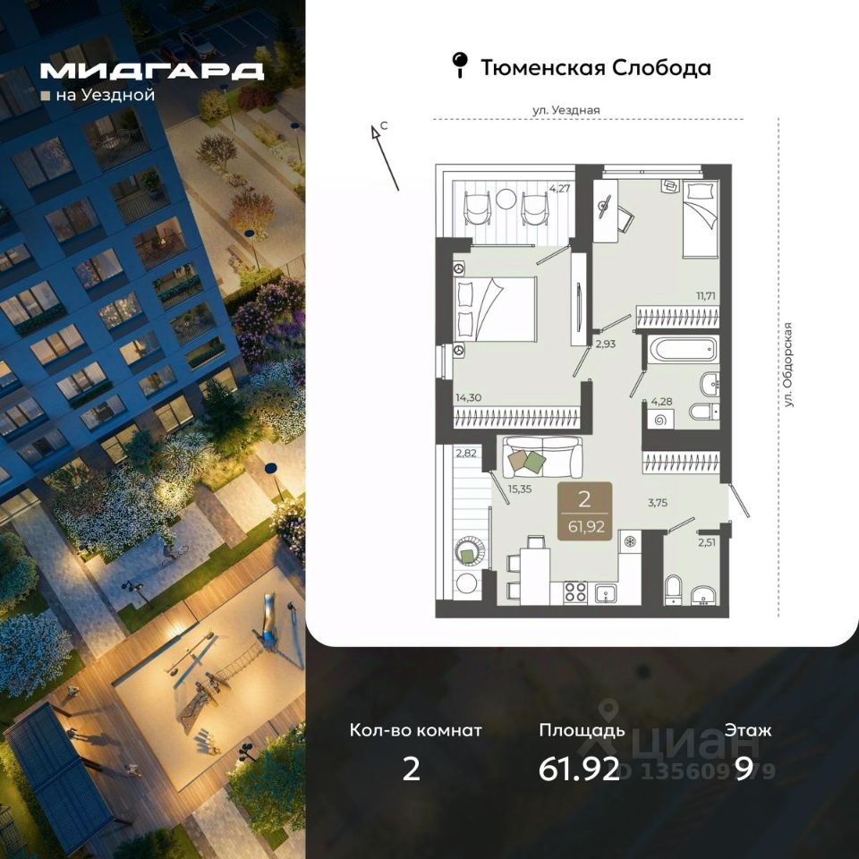 Продается двухкомнатная квартира от застройщика в ЖК ''Мидгард на Уездной'' на 9 этаже. Квартира без отделки, полностью готова к чистовой отделке и дальнейшему ремонту. Общая площадь: 61.92 кв.м., жилая: 26.01 кв.м., площадь просторной кухни-столовой: 15.35 кв.м. Квартира угловая, очень светлая, естественная вентиляция при открытии окон. В квартире две лоджии, один совмещенный и один раздельный санузел. Терраса представляет собой роскошную зону отдыха, где вы на свой вкус можете создать атмосферу комфорта и уюта. Высота потолков 2.72 м. Дом монолитный, черырехподъездный, переменной этажности, от 9 до 15 этажей. Квартира находится во 2-й секции высотой 9 этажей в корпусе ГП-1. На этаже 6 квартир. В подъезде 1 пассажирский и 1 грузовой лифт. Окончание строительства - 3 квартал 2027 года. Оформление сделки по договору долевого участия. ''Мидгард на Уездной'' - современный проект комфорт-класса, расположенный на первой линии Тюменской слободы, с видом на развязку Московского тракта. Он сочетает в себе современные архитектурные решения и комфортное проживание в гармонии с природой. Жилой комплекс находится в перспективном районе, который отличается транспортной доступностью: до крупных торговых центров ''Кристалл'' и ''Колумб'' можно добраться за 10 минут, а до центра города - за 15 минут. В шаговой доступности школы, детские сады, торговые центры и парки, что делает локацию идеальной для комфортной жизни. Проектом предусмотрены дома с дизайнерскими входными зонами и планировочными решения для любого сценария жизни с возможностью включить в ипотечный платеж ремонт, мебель и технику от застройщика. Закрытый двор и собственная аллея вдоль жилого комплекса позволят насладиться тишиной вдали от суеты большого города. #zMCOTb