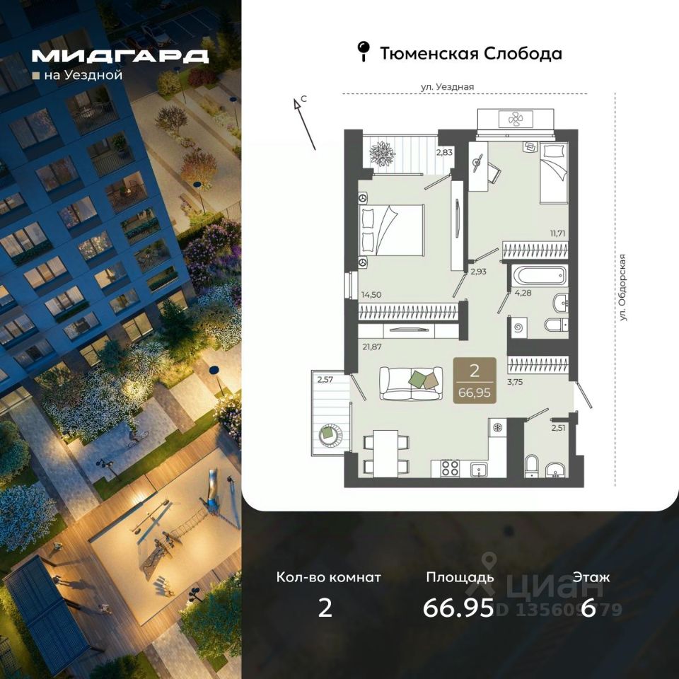 Просторная 2-комн. квартира в ЖК ''Мидгард на Уездной'' на 6 этаже. Квартира без отделки, после получения ключей можно делать ремонт. Общая площадь: 66.95 кв.м., жилая: 26.21 кв.м., площадь просторной кухни-столовой: 21.87 кв.м. Квартира угловая, идеально подойдет любителям тишины и панорамных видов. В квартире одна лоджия, один совмещенный и один раздельный санузел. Высота потолков 2.72 м. Дом монолитный, черырехподъездный, переменной этажности, от 9 до 15 этажей. Квартира находится во 2-й секции высотой 9 этажей в корпусе ГП-1. На этаже 6 квартир. В подъезде 1 пассажирский и 1 грузовой лифт. Окончание строительства - 3 квартал 2027 года. Оформление сделки по договору долевого участия. ''Мидгард на Уездной'' - современный проект комфорт-класса, расположенный на первой линии Тюменской слободы, с видом на развязку Московского тракта. Он сочетает в себе современные архитектурные решения и комфортное проживание в гармонии с природой. Жилой комплекс находится в перспективном районе, который отличается транспортной доступностью: до крупных торговых центров ''Кристалл'' и ''Колумб'' можно добраться за 10 минут, а до центра города - за 15 минут. В шаговой доступности школы, детские сады, торговые центры и парки, что делает локацию идеальной для комфортной жизни. Проектом предусмотрены дома с дизайнерскими входными зонами и планировочными решения для любого сценария жизни с возможностью включить в ипотечный платеж ремонт, мебель и технику от застройщика. Закрытый двор и собственная аллея вдоль жилого комплекса позволят насладиться тишиной вдали от суеты большого города. #2Mc0mg