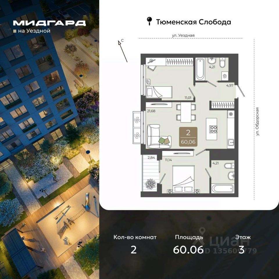 2-комн. квартира в ЖК ''Мидгард на Уездной'' на 3 этаже. Квартира без отделки, после выдачи ключей можно делать ремонт. Общая площадь: 60.06 кв.м., жилая: 22.15 кв.м., площадь просторной кухни-столовой: 21.68 кв.м. Комнаты изолированные, все окна выходят на одну сторону. В квартире одна лоджия, два совмещенных санузла. Высота потолков 2.72 м. Дом монолитный, черырехподъездный, переменной этажности, от 9 до 15 этажей. Квартира находится в 4-й секции высотой 15 этажей в корпусе ГП-1. На этаже 9 квартир. В подъезде 1 пассажирский и 1 грузовой лифт. Окончание строительства - 3 квартал 2027 года. Оформление сделки по договору долевого участия. ''Мидгард на Уездной'' - современный проект комфорт-класса, расположенный на первой линии Тюменской слободы, с видом на развязку Московского тракта. Он сочетает в себе современные архитектурные решения и комфортное проживание в гармонии с природой. Жилой комплекс находится в перспективном районе, который отличается транспортной доступностью: до крупных торговых центров ''Кристалл'' и ''Колумб'' можно добраться за 10 минут, а до центра города - за 15 минут. В шаговой доступности школы, детские сады, торговые центры и парки, что делает локацию идеальной для комфортной жизни. Проектом предусмотрены дома с дизайнерскими входными зонами и планировочными решения для любого сценария жизни с возможностью включить в ипотечный платеж ремонт, мебель и технику от застройщика. Закрытый двор и собственная аллея вдоль жилого комплекса позволят насладиться тишиной вдали от суеты большого города. #2m5DOa