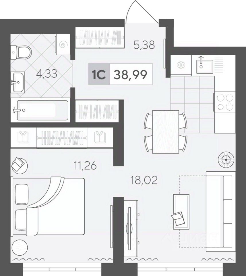 Продаётся 1-комнатная квартира в строящемся доме (ГП 2 (Сергея Корепанова, 34)), срок сдачи: IV-кв. 2027, общей площадью 38.99 кв.м., на 9 этаже. Новый жилой комплекс ''Скандиа. Квартал у Леса'' от Специализированного застройщика ''СКАНДИА У ЛЕСА'' расположен в г. Тюмень на ул. Бориса Прудаева.
