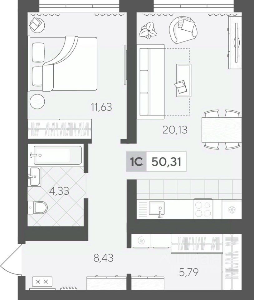 Продаётся 1-комнатная квартира в строящемся доме (ГП 2 (Сергея Корепанова, 34)), срок сдачи: IV-кв. 2027, общей площадью 50.31 кв.м., на 7 этаже. Новый жилой комплекс ''Скандиа. Квартал у Леса'' от Специализированного застройщика ''СКАНДИА У ЛЕСА'' расположен в г. Тюмень на ул. Бориса Прудаева.