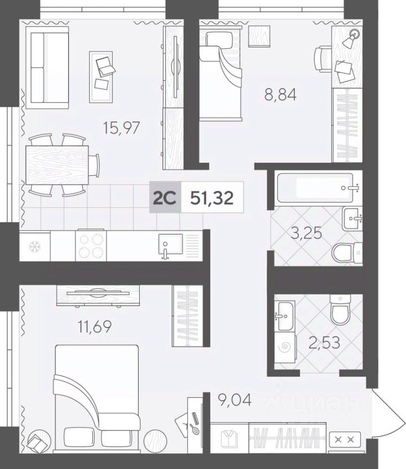 Продаётся 2-комнатная квартира в строящемся доме (ГП 2 (Сергея Корепанова, 34)), срок сдачи: IV-кв. 2027, общей площадью 51.32 кв.м., на 9 этаже. Новый жилой комплекс ''Скандиа. Квартал у Леса'' от Специализированного застройщика ''СКАНДИА У ЛЕСА'' расположен в г. Тюмень на ул. Бориса Прудаева.