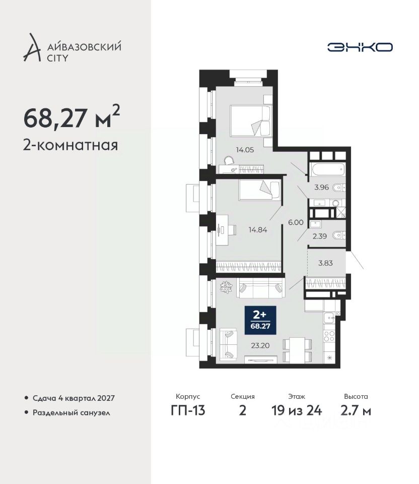 Просторная 2-комн. квартира в ЖК ''Айвазовский City'' на 19 этаже. Общая площадь: 68.27 кв.м. Высота потолков 2.7 м. Дом монолитный, многоподъездный, высотой 24 этажа. Квартира находится во 2-й секции в корпусе ГП-13. На этаже 6 квартир. В подъезде 1 пассажирский и 1 грузовой лифт. Окончание строительства - 4 квартал 2027 года. Оформление сделки по договору долевого участия. Новый жилой район располагается в живописном месте на берегу Туры в центральной части города. Принципиально новое пространство для жизни в центре современного города для тех, чьи мечты сбываются, кто нацелен на постоянный рост, перемены к лучшему для себя и своих близких. Каждая деталь Айвазовский City вдохновляет и заряжает на новые свершения: авторская архитектура, сбалансированная продуманная инфраструктура, дизайнерские дворы со спортивными и детскими площадками, парковые зоны с фонтанами, водный канал, украшающий центральный прогулочный маршрут района и многое другое. В 2019 года проект стал лауреатом престижной премии Urban Awards 2019 в номинации ''Лучший строящийся региональный жилой комплекс бизнес-класса''. Главная особенность Айвазовский City - соседство разных архитектурных школ в рамках одного дома. Изысканная классика, выразительная эклектика и оригинальный модерн - жить в одном из таких домов настоящий повод для гордости. Айвазовский City это идеальное сочетание комфорта, технологий и развитой инфраструктуры. Вход в подъезд возможен с улицы и со двора. Отправляясь на работу или за покупками, жители могут выйти с внешней стороны дома, а для прогулки с ребенком со стороны двора. Экологически чистые материалы и энергосберегающие технологии, качественное освещение общественных зон, видеонаблюдение по всей территории жилого района (в том числе в подъездах, лифтах и в подземном паркинге), закрытые дворы с доступом только для жителей Айвазовский City. Часть домов в Айвазовский City будут оснащены подземным паркингом. Востребованный в нашем климатическом поясе формат хранения автомобилей защитит собственность владельца в любое время года. Аккредитация в банках: ПАО Банк ''ВТБ'', ''Сбербанк России'', ОАО ''Альфа-Банк'', ПАО ''Газпромбанк'', ПАО ''Совкомбанк'' и других. #ZmezaT