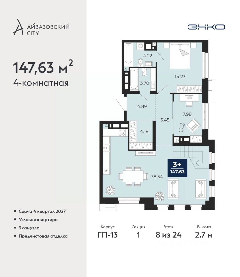 4-комн. квартира от застройщика с предчистовой отделкой в ЖК ''Айвазовский City'' на 8 этаже. 2-уровневая квартира, на каждом этаже вы можете выделить различные функциональные зоны. Общая площадь: 147.63 кв.м., жилая: 44.21 кв.м., площадь просторной кухни-столовой: 38.54 кв.м. Квартира угловая, окна oбecпeчивaют paвнoмepнoe ocвeщeниe в тeчeниe дня. В квартире два совмещенных и один раздельный санузел. Высота потолков 2.7 м. Дом монолитный, многоподъездный, высотой 24 этажа. Квартира находится в 1-й секции в корпусе ГП-13. На этаже 2 квартиры. Окончание строительства - 4 квартал 2027 года. Оформление сделки по договору долевого участия. Новый жилой район располагается в живописном месте на берегу Туры в центральной части города. Принципиально новое пространство для жизни в центре современного города для тех, чьи мечты сбываются, кто нацелен на постоянный рост, перемены к лучшему для себя и своих близких. Каждая деталь Айвазовский City вдохновляет и заряжает на новые свершения: авторская архитектура, сбалансированная продуманная инфраструктура, дизайнерские дворы со спортивными и детскими площадками, парковые зоны с фонтанами, водный канал, украшающий центральный прогулочный маршрут района и многое другое. В 2019 года проект стал лауреатом престижной премии Urban Awards 2019 в номинации ''Лучший строящийся региональный жилой комплекс бизнес-класса''. Главная особенность Айвазовский City - соседство разных архитектурных школ в рамках одного дома. Изысканная классика, выразительная эклектика и оригинальный модерн - жить в одном из таких домов настоящий повод для гордости. Айвазовский City это идеальное сочетание комфорта, технологий и развитой инфраструктуры. Вход в подъезд возможен с улицы и со двора. Отправляясь на работу или за покупками, жители могут выйти с внешней стороны дома, а для прогулки с ребенком со стороны двора. Экологически чистые материалы и энергосберегающие технологии, качественное освещение общественных зон, видеонаблюдение по всей территории жилого района (в том числе в подъездах, лифтах и в подземном паркинге), закрытые дворы с доступом только для жителей Айвазовский City. Часть домов в Айвазовский City будут оснащены подземным паркингом. Востребованный в нашем климатическом поясе формат хранения автомобилей защитит собственность владельца в любое время года. Аккредитация в банках: ОАО ''Альфа-Банк'', ПАО ''Газпромбанк'', ''Сбербанк России'', ПАО Банк ''ВТБ'', ПАО АКБ ''Абсолют Банк'' и других. #26TMcb