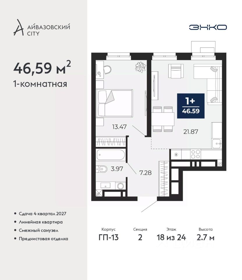 Продается однокомнатная квартира с предчистовой отделкой в ЖК ''Айвазовский City'' на 18 этаже. Общая площадь: 46.59 кв.м., жилая: 13.47 кв.м., площадь просторной кухни-столовой: 21.87 кв.м. Все окна выходят на одну сторону. В квартире один совмещенный санузел. Высота потолков 2.7 м. Дом монолитный, многоподъездный, высотой 24 этажа. Квартира находится во 2-й секции в корпусе ГП-13. На этаже 6 квартир. В подъезде 1 пассажирский и 1 грузовой лифт. Окончание строительства - 4 квартал 2027 года. Оформление сделки по договору долевого участия. Новый жилой район располагается в живописном месте на берегу Туры в центральной части города. Принципиально новое пространство для жизни в центре современного города для тех, чьи мечты сбываются, кто нацелен на постоянный рост, перемены к лучшему для себя и своих близких. Каждая деталь Айвазовский City вдохновляет и заряжает на новые свершения: авторская архитектура, сбалансированная продуманная инфраструктура, дизайнерские дворы со спортивными и детскими площадками, парковые зоны с фонтанами, водный канал, украшающий центральный прогулочный маршрут района и многое другое. В 2019 года проект стал лауреатом престижной премии Urban Awards 2019 в номинации ''Лучший строящийся региональный жилой комплекс бизнес-класса''. Главная особенность Айвазовский City - соседство разных архитектурных школ в рамках одного дома. Изысканная классика, выразительная эклектика и оригинальный модерн - жить в одном из таких домов настоящий повод для гордости. Айвазовский City это идеальное сочетание комфорта, технологий и развитой инфраструктуры. Вход в подъезд возможен с улицы и со двора. Отправляясь на работу или за покупками, жители могут выйти с внешней стороны дома, а для прогулки с ребенком со стороны двора. Экологически чистые материалы и энергосберегающие технологии, качественное освещение общественных зон, видеонаблюдение по всей территории жилого района (в том числе в подъездах, лифтах и в подземном паркинге), закрытые дворы с доступом только для жителей Айвазовский City. Часть домов в Айвазовский City будут оснащены подземным паркингом. Востребованный в нашем климатическом поясе формат хранения автомобилей защитит собственность владельца в любое время года. Аккредитация в банках: ПАО ''Газпромбанк'', ПАО Банк ''ВТБ'', ОАО ''Альфа-Банк'', ''Сбербанк России'', ПАО ''Промсвязьбанк'' и других. #z6Vgcf