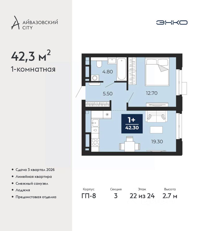 Однокомнатная квартира от застройщика с предчистовой отделкой в ЖК ''Айвазовский City'' на 22 этаже. Общая площадь: 42.3 кв.м., жилая: 13.4 кв.м., площадь просторной кухни-столовой: 17.1 кв.м. Все окна выходят на одну сторону. В квартире одна лоджия, один совмещенный санузел. Высота потолков 2.7 м. Дом монолитный, многоподъездный, переменной этажности, от 14 до 24 этажей. Квартира находится в 3-й секции высотой 24 этажа в корпусе ГП-8. На этаже 7 квартир. В подъезде 1 пассажирский и 1 грузовой лифт. Окончание строительства - 3 квартал 2026 года. Оформление сделки по договору долевого участия. Новый жилой район располагается в живописном месте на берегу Туры в центральной части города. Принципиально новое пространство для жизни в центре современного города для тех, чьи мечты сбываются, кто нацелен на постоянный рост, перемены к лучшему для себя и своих близких. Каждая деталь Айвазовский City вдохновляет и заряжает на новые свершения: авторская архитектура, сбалансированная продуманная инфраструктура, дизайнерские дворы со спортивными и детскими площадками, парковые зоны с фонтанами, водный канал, украшающий центральный прогулочный маршрут района и многое другое. В 2019 года проект стал лауреатом престижной премии Urban Awards 2019 в номинации ''Лучший строящийся региональный жилой комплекс бизнес-класса''. Главная особенность Айвазовский City - соседство разных архитектурных школ в рамках одного дома. Изысканная классика, выразительная эклектика и оригинальный модерн - жить в одном из таких домов настоящий повод для гордости. Айвазовский City это идеальное сочетание комфорта, технологий и развитой инфраструктуры. Вход в подъезд возможен с улицы и со двора. Отправляясь на работу или за покупками, жители могут выйти с внешней стороны дома, а для прогулки с ребенком со стороны двора. Экологически чистые материалы и энергосберегающие технологии, качественное освещение общественных зон, видеонаблюдение по всей территории жилого района (в том числе в подъездах, лифтах и в подземном паркинге), закрытые дворы с доступом только для жителей Айвазовский City. Часть домов в Айвазовский City будут оснащены подземным паркингом. Востребованный в нашем климатическом поясе формат хранения автомобилей защитит собственность владельца в любое время года. Аккредитация в банках: ПАО Банк ''ВТБ'', ОАО ''Альфа-Банк'', ''Сбербанк России'', ПАО ''Газпромбанк'', ПАО ''Совкомбанк'' и других. #2svVDD