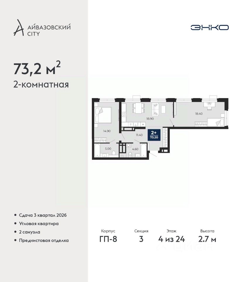 Продается двухкомнатная квартира с предчистовой отделкой в ЖК ''Айвазовский City'' на 4 этаже. Общая площадь: 73.2 кв.м., жилая: 32.1 кв.м., площадь просторной кухни-столовой: 21.7 кв.м. Квартира угловая, идеально подойдет любителям тишины и панорамных видов. В квартире два совмещенных санузла. Высота потолков 2.7 м. Дом монолитный, многоподъездный, переменной этажности, от 14 до 24 этажей. Квартира находится в 3-й секции высотой 24 этажа в корпусе ГП-8. На этаже 7 квартир. В подъезде 1 пассажирский и 1 грузовой лифт. Окончание строительства - 3 квартал 2026 года. Оформление сделки по договору долевого участия. Новый жилой район располагается в живописном месте на берегу Туры в центральной части города. Принципиально новое пространство для жизни в центре современного города для тех, чьи мечты сбываются, кто нацелен на постоянный рост, перемены к лучшему для себя и своих близких. Каждая деталь Айвазовский City вдохновляет и заряжает на новые свершения: авторская архитектура, сбалансированная продуманная инфраструктура, дизайнерские дворы со спортивными и детскими площадками, парковые зоны с фонтанами, водный канал, украшающий центральный прогулочный маршрут района и многое другое. В 2019 года проект стал лауреатом престижной премии Urban Awards 2019 в номинации ''Лучший строящийся региональный жилой комплекс бизнес-класса''. Главная особенность Айвазовский City - соседство разных архитектурных школ в рамках одного дома. Изысканная классика, выразительная эклектика и оригинальный модерн - жить в одном из таких домов настоящий повод для гордости. Айвазовский City это идеальное сочетание комфорта, технологий и развитой инфраструктуры. Вход в подъезд возможен с улицы и со двора. Отправляясь на работу или за покупками, жители могут выйти с внешней стороны дома, а для прогулки с ребенком со стороны двора. Экологически чистые материалы и энергосберегающие технологии, качественное освещение общественных зон, видеонаблюдение по всей территории жилого района (в том числе в подъездах, лифтах и в подземном паркинге), закрытые дворы с доступом только для жителей Айвазовский City. Часть домов в Айвазовский City будут оснащены подземным паркингом. Востребованный в нашем климатическом поясе формат хранения автомобилей защитит собственность владельца в любое время года. Аккредитация в банках: ''Сбербанк России'', ПАО Банк ''ВТБ'', ПАО ''Газпромбанк'', ОАО ''Альфа-Банк'', ПАО ''Совкомбанк'' и других. #26Sf9s