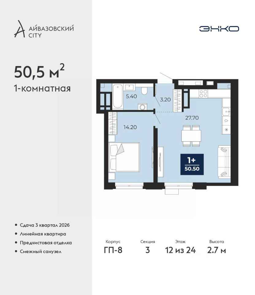 Продается однокомнатная квартира от застройщика с предчистовой отделкой в ЖК ''Айвазовский City'' на 12 этаже. Общая площадь: 50.5 кв.м., жилая: 14.2 кв.м., площадь просторной кухни-столовой: 27.7 кв.м. Все окна выходят на одну сторону. В квартире один совмещенный санузел. Высота потолков 2.7 м. Дом монолитный, многоподъездный, переменной этажности, от 14 до 24 этажей. Квартира находится в 3-й секции высотой 24 этажа в корпусе ГП-8. На этаже 7 квартир. В подъезде 1 пассажирский и 1 грузовой лифт. Окончание строительства - 3 квартал 2026 года. Оформление сделки по договору долевого участия. Новый жилой район располагается в живописном месте на берегу Туры в центральной части города. Принципиально новое пространство для жизни в центре современного города для тех, чьи мечты сбываются, кто нацелен на постоянный рост, перемены к лучшему для себя и своих близких. Каждая деталь Айвазовский City вдохновляет и заряжает на новые свершения: авторская архитектура, сбалансированная продуманная инфраструктура, дизайнерские дворы со спортивными и детскими площадками, парковые зоны с фонтанами, водный канал, украшающий центральный прогулочный маршрут района и многое другое. В 2019 года проект стал лауреатом престижной премии Urban Awards 2019 в номинации ''Лучший строящийся региональный жилой комплекс бизнес-класса''. Главная особенность Айвазовский City - соседство разных архитектурных школ в рамках одного дома. Изысканная классика, выразительная эклектика и оригинальный модерн - жить в одном из таких домов настоящий повод для гордости. Айвазовский City это идеальное сочетание комфорта, технологий и развитой инфраструктуры. Вход в подъезд возможен с улицы и со двора. Отправляясь на работу или за покупками, жители могут выйти с внешней стороны дома, а для прогулки с ребенком со стороны двора. Экологически чистые материалы и энергосберегающие технологии, качественное освещение общественных зон, видеонаблюдение по всей территории жилого района (в том числе в подъездах, лифтах и в подземном паркинге), закрытые дворы с доступом только для жителей Айвазовский City. Часть домов в Айвазовский City будут оснащены подземным паркингом. Востребованный в нашем климатическом поясе формат хранения автомобилей защитит собственность владельца в любое время года. Аккредитация в банках: ''Сбербанк России'', ПАО Банк ''ВТБ'', ПАО ''Газпромбанк'', ОАО ''Альфа-Банк'', ПАО Банк ''ФК Открытие'' и других. #Zmd3FB