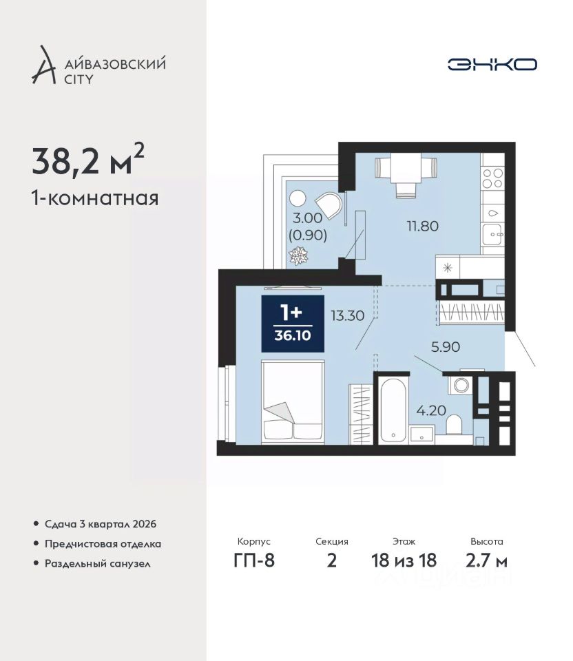 Продается 1-комн. квартира от застройщика с предчистовой отделкой в ЖК ''Айвазовский City'' на 18 этаже. Общая площадь: 38.2 кв.м. Высота потолков 2.7 м. Дом монолитный, многоподъездный, переменной этажности, от 14 до 24 этажей. Квартира находится во 2-й секции высотой 18 этажей в корпусе ГП-8. На этаже 5 квартир. В подъезде 1 пассажирский и 1 грузовой лифт. Окончание строительства - 3 квартал 2026 года. Оформление сделки по договору долевого участия. Новый жилой район располагается в живописном месте на берегу Туры в центральной части города. Принципиально новое пространство для жизни в центре современного города для тех, чьи мечты сбываются, кто нацелен на постоянный рост, перемены к лучшему для себя и своих близких. Каждая деталь Айвазовский City вдохновляет и заряжает на новые свершения: авторская архитектура, сбалансированная продуманная инфраструктура, дизайнерские дворы со спортивными и детскими площадками, парковые зоны с фонтанами, водный канал, украшающий центральный прогулочный маршрут района и многое другое. В 2019 года проект стал лауреатом престижной премии Urban Awards 2019 в номинации ''Лучший строящийся региональный жилой комплекс бизнес-класса''. Главная особенность Айвазовский City - соседство разных архитектурных школ в рамках одного дома. Изысканная классика, выразительная эклектика и оригинальный модерн - жить в одном из таких домов настоящий повод для гордости. Айвазовский City это идеальное сочетание комфорта, технологий и развитой инфраструктуры. Вход в подъезд возможен с улицы и со двора. Отправляясь на работу или за покупками, жители могут выйти с внешней стороны дома, а для прогулки с ребенком со стороны двора. Экологически чистые материалы и энергосберегающие технологии, качественное освещение общественных зон, видеонаблюдение по всей территории жилого района (в том числе в подъездах, лифтах и в подземном паркинге), закрытые дворы с доступом только для жителей Айвазовский City. Часть домов в Айвазовский City будут оснащены подземным паркингом. Востребованный в нашем климатическом поясе формат хранения автомобилей защитит собственность владельца в любое время года. Аккредитация в банках: ''Сбербанк России'', ОАО ''Альфа-Банк'', ПАО ''Газпромбанк'', ПАО Банк ''ВТБ'', ПАО АКБ ''Абсолют Банк'' и других. #26dfca