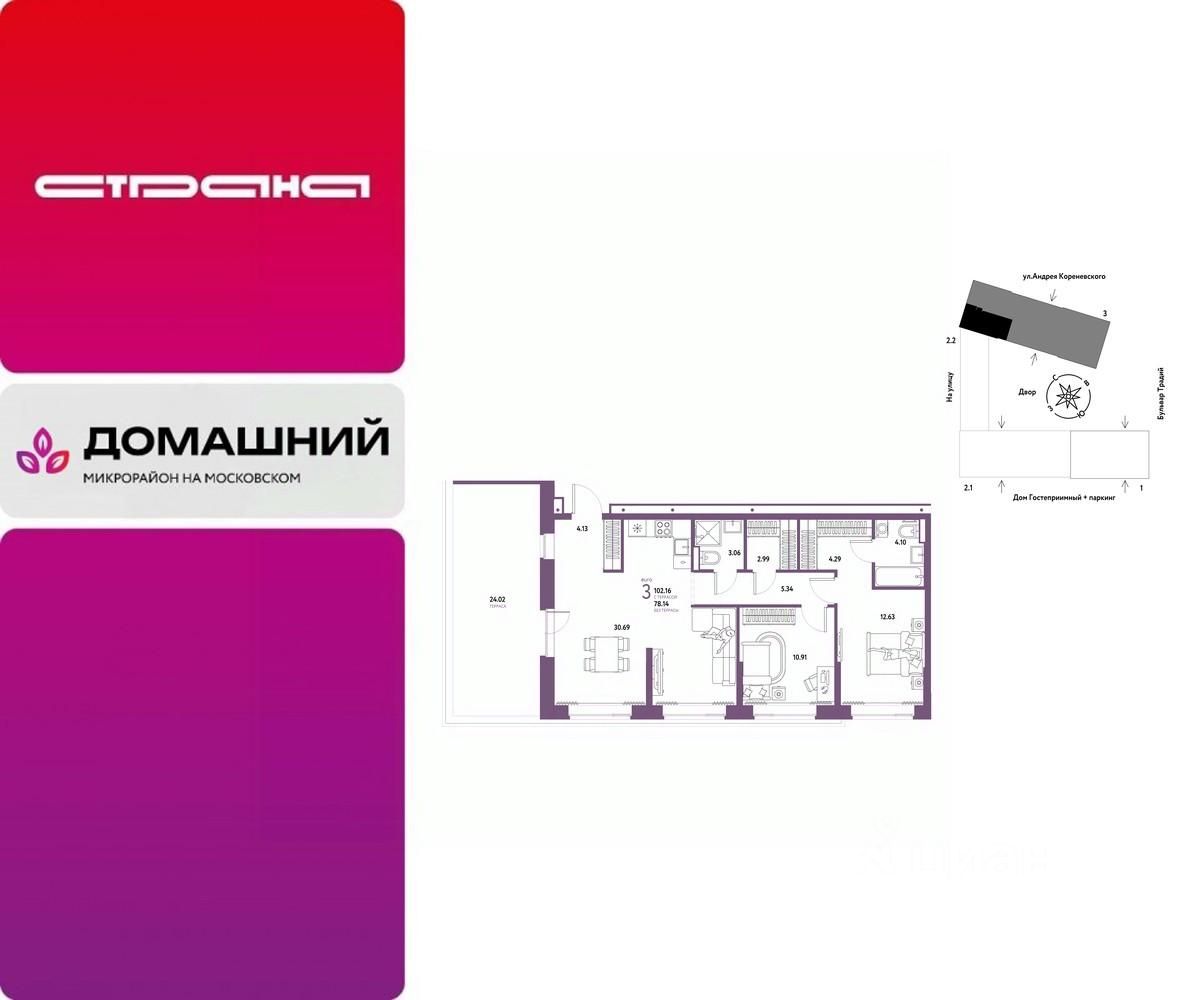 Объявление от застройщика Страна Девелопмент. Покупка квартиры защищена банком. Продается 3комнатная квартира на 12 этаже от застройщика Страна Девелопмент. Площадь квартиры 102,16 кв. м. О ПРОЕКТЕ Микрорайон ''Домашний'' — это 6 очередей строительства, 24 дома переменной этажности. Каждый дом уникальный. Внутри микрорайона появится огромный пешеходный бульвар — бульвар Традиций. Центром притяжения станут открытые пространства для отдыха жителей и гостей микрорайона, которые легко меняются под сезонные сценарии отдыха: новогодняя елка, ярмарки, кинопоказы и т.д. У каждого дома обустроен приватный двор с зонами для активного и спокойного отдыха. В активной зоне детские разновозрастные площадки с горками, песочницами и качелями, воркаут-зоны. В спокойной — скамейки, мини-амфитеатры, закрытые перголы. Уютной атмосферу сделает обильное озеленение и освещение ''домашними'' торшерами. ОТДЕЛКА Квартиры сдаются с предчистовой отделкой. Все грязные работы выполнены: произведена разводка электричества и отопления, выполнена стяжка пола, стены выровнены ''под маяк''. В квартире установлены розетки, выключатели и радиаторы. На входе — надежная стальная дверь. Вам остается только выбрать материалы и начать ремонт Доступна опция ''Ремонт от застройщика''. Стоимость можно включить в ипотеку. Вы можете заказать один из пяти стилей на выбор: шалфей, хлопковая нить, серый шторм, голубой вереск, белый камень. КУХНЯ С ТЕХНИКОЙ Теперь дополнительно к ремонту можно заказать кухню со встроенной техникой. Эргономику и функциональное наполнение разработали под каждую планировку. ПОЛНАЯ МЕБЛИРОВКА Больше не нужно тратить время даже на подбор, доставку и сборку мебели.Вы можете включить в стоимость квартиры с ремонтом полную меблировку. - Что входит в меблировку? - Кухня с техникой и сантехникой - Диван - Кровать - Шкаф в спальне - Шкаф в прихожей На консультации менеджер подскажет, какие акции действуют, и как получить одобрение по ипотеке с низкой ставкой. Более подробная информация по телефону.