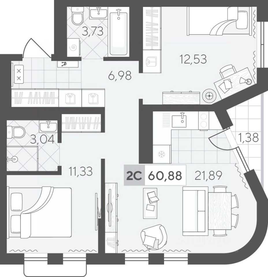 Квартал в Комарово Парк — шесть домов переменной этажности и два наземных паркинга, которые формируют уютную квартальную застройку, органично вписываясь в природное окружение. Здесь можно наслаждаться тишиной, сохраняя доступность городской инфраструктуры. Комарово Парк — это новый район города с собственной инфраструктурой, расположенный в черте города и в то же время рядом с природой. Квартира с двумя спальнями площадью 60.88 кв.м на 5 этаже. Продуманная геометрия комнат позволит легко зонировать пространство для личного досуга и места, где удобно проводить время с семьей или встречать гостей.