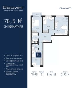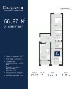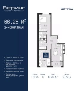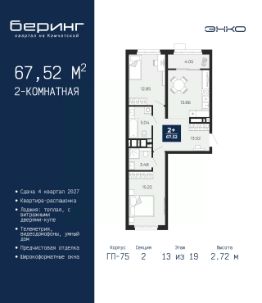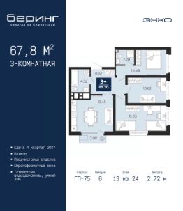 2-комн. квартира с предчистовой отделкой в ЖК ''Беринг'' на 9 этаже. Общая площадь: 72.82 кв.м., жилая: 31.81 кв.м., площадь просторной кухни-столовой: 20.62 кв.м. Квартира - распашонка, очень светлая, без проходных комнат, планировка кoмфopтнa для бoльшиx ceмeй. В квартире один балкон, один совмещенный и один раздельный санузел. Высота потолков 2.75 м. Дом монолитный, многоподъездный, переменной этажности, от 9 до 22 этажей. Квартира находится в 73.5-й секции высотой 21 этаж в корпусе ГП-73. На этаже 6 квартир. В подъезде 1 пассажирский и 1 грузовой лифт. Окончание строительства - 1 квартал 2026 года. Оформление сделки по договору долевого участия. Подобно знаменитому исследователю, мы чувствуем себя первооткрывателями этой локации. Хотим показать новую суть места, сформировать для вас жизненный опыт, которого ещё не было. Беринг — район зелёного цвета. Беринг — район, который откроется вам с другой стороны. Впечатлит новым уровнем комфорта и качеством жизни. Беринг — открытие на карте города. Первый квартал расположен в районе Тура, в границах улиц: Камчатская Западносибирская Энтузиастов. Вокруг уже есть всё для того, чтобы ежедневная рутина была лишь частью жизни и не доставляла дискомфорта.Школы и детские сады, магазины и аптеки, поликлиника, места для семейного отдыха, пеших и велопрогулок, и даже рыбалки. Масштабное озеленение дворов — визитная карточка ЭНКО и ваш оазис спокойствия, чтобы отвлечься от повседневности. Раскидистые деревья, кустарники, травы и цветы — осталось остановиться, вдохнуть и расслабиться, глядя на эту природную красоту. Стилистика подъездов продолжает концепцию Беринга, вдохновлённого Камчаткой: сдержанный,но при этом впечатляющий дизайн соседствует с удобством и функциональностью. #26gz68
