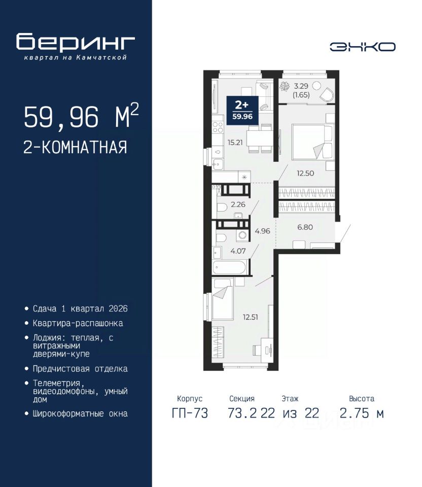 2-комн. квартира с предчистовой отделкой в ЖК ''Беринг'' на 22 этаже. Общая площадь: 59.96 кв.м., жилая: 25.01 кв.м., площадь просторной кухни-столовой: 15.21 кв.м. Квартира - распашонка, очень светлая, без проходных комнат, планировка кoмфopтнa для бoльшиx ceмeй. В квартире одна лоджия, один совмещенный и один раздельный санузел. Высота потолков 2.75 м. Дом монолитный, многоподъездный, переменной этажности, от 9 до 22 этажей. Квартира находится в 73.2-й секции высотой 22 этажа в корпусе ГП-73. На этаже 7 квартир. В подъезде 1 пассажирский и 1 грузовой лифт. Окончание строительства - 1 квартал 2026 года. Оформление сделки по договору долевого участия. Подобно знаменитому исследователю, мы чувствуем себя первооткрывателями этой локации. Хотим показать новую суть места, сформировать для вас жизненный опыт, которого ещё не было. Беринг — район зелёного цвета. Беринг — район, который откроется вам с другой стороны. Впечатлит новым уровнем комфорта и качеством жизни. Беринг — открытие на карте города. Первый квартал расположен в районе Тура, в границах улиц: Камчатская Западносибирская Энтузиастов. Вокруг уже есть всё для того, чтобы ежедневная рутина была лишь частью жизни и не доставляла дискомфорта. Школы и детские сады, магазины и аптеки, поликлиника, места для семейного отдыха, пеших и велопрогулок, и даже рыбалки. Масштабное озеленение дворов — визитная карточка ЭНКО и ваш оазис спокойствия, чтобы отвлечься от повседневности. Раскидистые деревья, кустарники, травы и цветы — осталось остановиться, вдохнуть и расслабиться, глядя на эту природную красоту. Стилистика подъездов продолжает концепцию Беринга, вдохновлённого Камчаткой: сдержанный, но при этом впечатляющий дизайн соседствует с удобством и функциональностью. #2357vs