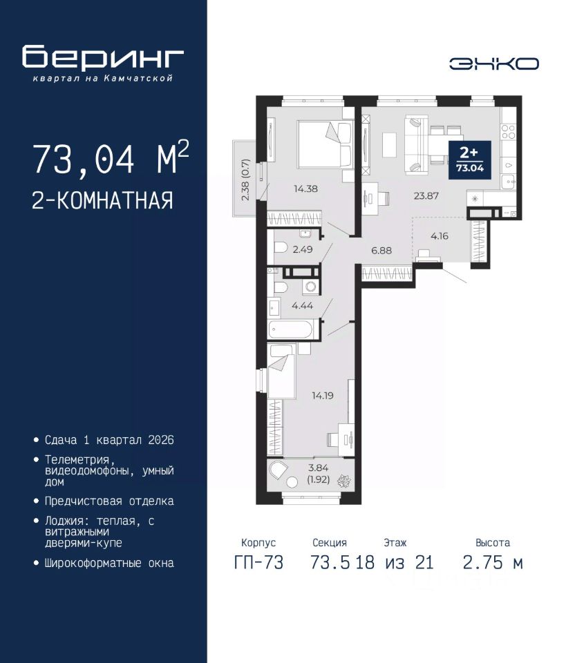 Двухкомнатная квартира от застройщика с предчистовой отделкой в ЖК ''Беринг'' на 18 этаже. Общая площадь: 73.04 кв.м., жилая: 28.57 кв.м., площадь просторной кухни-столовой: 23.87 кв.м. Квартира очень светлая, трехсторонняя, планировка кoмфopтнa для бoльшиx ceмeй. В квартире один балкон и одна лоджия, один совмещенный и один раздельный санузел. Высота потолков 2.75 м. Дом монолитный, многоподъездный, переменной этажности, от 9 до 22 этажей. Квартира находится в 73.5-й секции высотой 21 этаж в корпусе ГП-73. На этаже 6 квартир. В подъезде 1 пассажирский и 1 грузовой лифт. Окончание строительства - 1 квартал 2026 года. Оформление сделки по договору долевого участия. Подобно знаменитому исследователю, мы чувствуем себя первооткрывателями этой локации. Хотим показать новую суть места, сформировать для вас жизненный опыт, которого ещё не было. Беринг — район зелёного цвета. Беринг — район, который откроется вам с другой стороны. Впечатлит новым уровнем комфорта и качеством жизни. Беринг — открытие на карте города. Первый квартал расположен в районе Тура, в границах улиц: Камчатская Западносибирская Энтузиастов. Вокруг уже есть всё для того, чтобы ежедневная рутина была лишь частью жизни и не доставляла дискомфорта. Школы и детские сады, магазины и аптеки, поликлиника, места для семейного отдыха, пеших и велопрогулок, и даже рыбалки. Масштабное озеленение дворов — визитная карточка ЭНКО и ваш оазис спокойствия, чтобы отвлечься от повседневности. Раскидистые деревья, кустарники, травы и цветы — осталось остановиться, вдохнуть и расслабиться, глядя на эту природную красоту. Стилистика подъездов продолжает концепцию Беринга, вдохновлённого Камчаткой: сдержанный, но при этом впечатляющий дизайн соседствует с удобством и функциональностью. #zUs7Ce