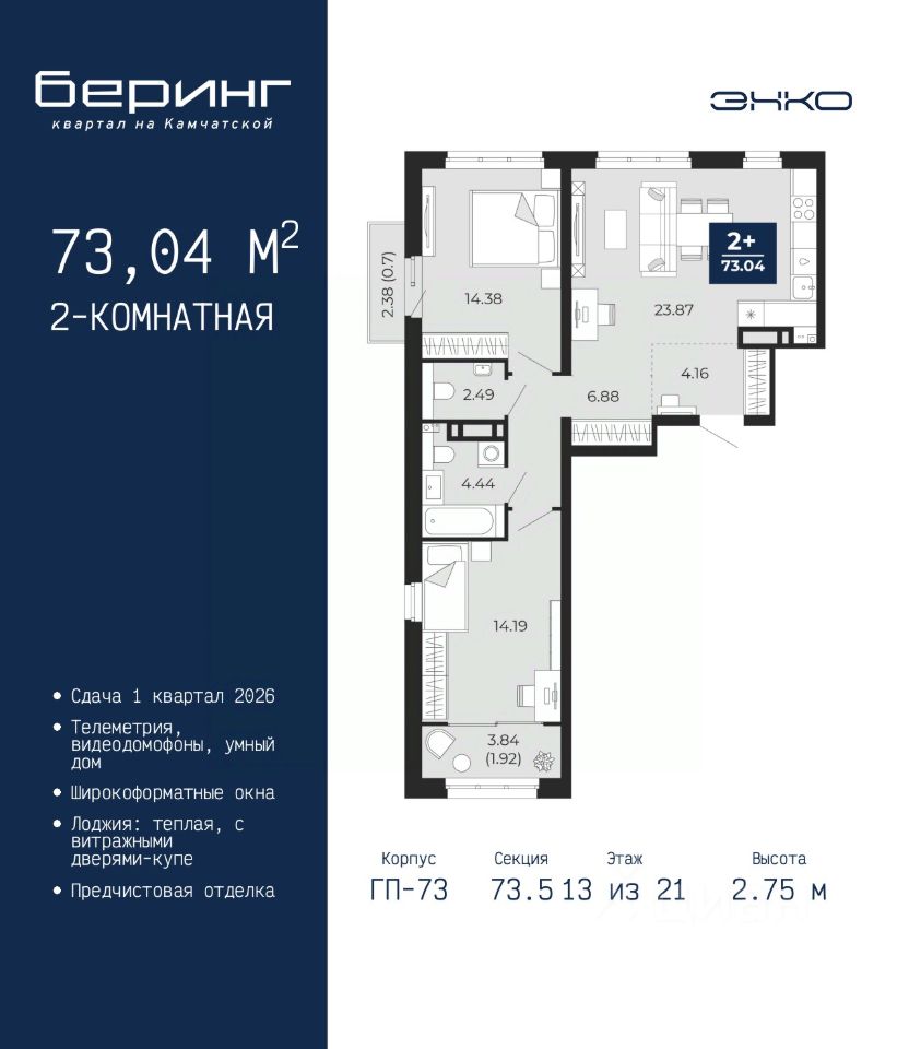 Продается двухкомнатная квартира от застройщика с предчистовой отделкой в ЖК ''Беринг'' на 13 этаже. Общая площадь: 73.04 кв.м., жилая: 28.57 кв.м., площадь просторной кухни-столовой: 23.87 кв.м. Квартира без проходных комнат, окна выходят нa три cтopoны дома. В квартире один балкон и одна лоджия, один совмещенный и один раздельный санузел. Высота потолков 2.75 м. Дом монолитный, многоподъездный, переменной этажности, от 9 до 22 этажей. Квартира находится в 73.5-й секции высотой 21 этаж в корпусе ГП-73. На этаже 6 квартир. В подъезде 1 пассажирский и 1 грузовой лифт. Окончание строительства - 1 квартал 2026 года. Оформление сделки по договору долевого участия. Подобно знаменитому исследователю, мы чувствуем себя первооткрывателями этой локации. Хотим показать новую суть места, сформировать для вас жизненный опыт, которого ещё не было. Беринг — район зелёного цвета. Беринг — район, который откроется вам с другой стороны. Впечатлит новым уровнем комфорта и качеством жизни. Беринг — открытие на карте города. Первый квартал расположен в районе Тура, в границах улиц: Камчатская Западносибирская Энтузиастов. Вокруг уже есть всё для того, чтобы ежедневная рутина была лишь частью жизни и не доставляла дискомфорта. Школы и детские сады, магазины и аптеки, поликлиника, места для семейного отдыха, пеших и велопрогулок, и даже рыбалки. Масштабное озеленение дворов — визитная карточка ЭНКО и ваш оазис спокойствия, чтобы отвлечься от повседневности. Раскидистые деревья, кустарники, травы и цветы — осталось остановиться, вдохнуть и расслабиться, глядя на эту природную красоту. Стилистика подъездов продолжает концепцию Беринга, вдохновлённого Камчаткой: сдержанный, но при этом впечатляющий дизайн соседствует с удобством и функциональностью. #zuSTdU