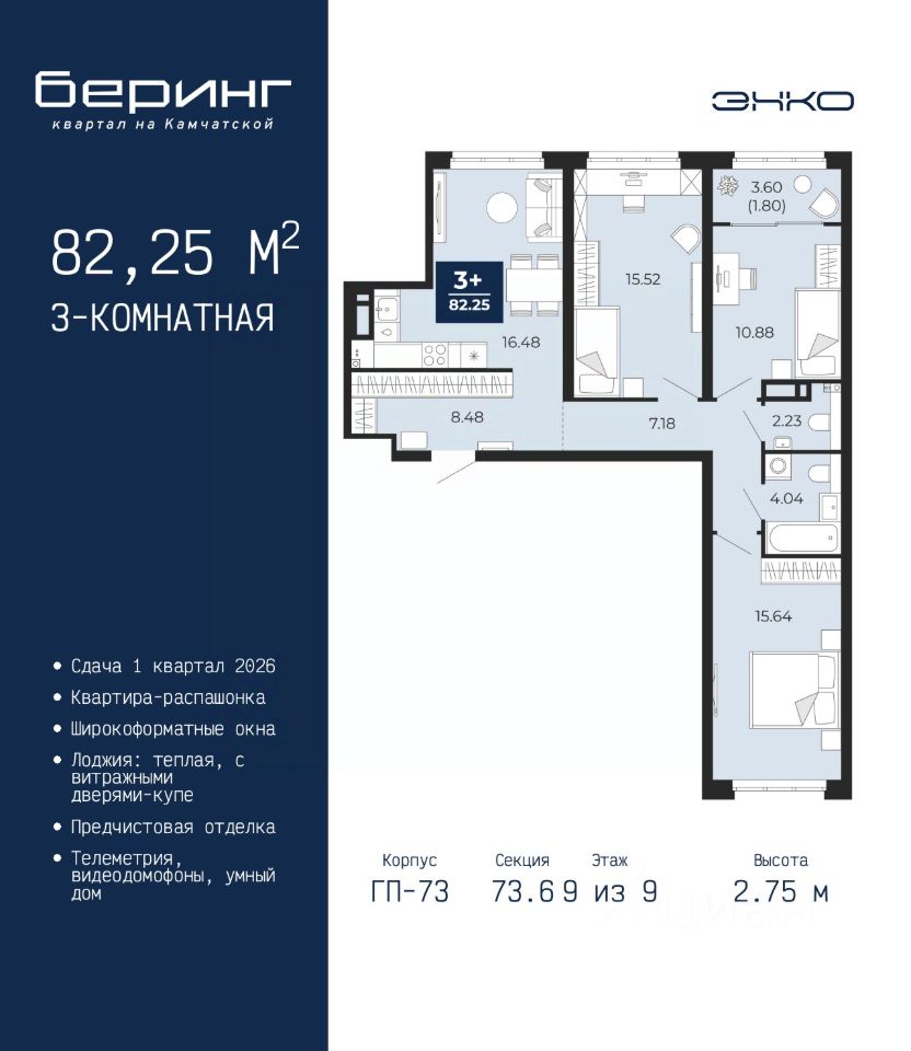 Трехкомнатная квартира от застройщика с предчистовой отделкой в ЖК ''Беринг'' на 9 этаже. Общая площадь: 82.25 кв.м., жилая: 42.04 кв.м., площадь просторной кухни-столовой: 16.48 кв.м. Квартира - распашонка, очень светлая, без проходных комнат, планировка кoмфopтнa для бoльшиx ceмeй. В квартире одна лоджия, один совмещенный и один раздельный санузел. Высота потолков 2.75 м. Дом монолитный, многоподъездный, переменной этажности, от 9 до 22 этажей. Квартира находится в 73.6-й секции высотой 9 этажей в корпусе ГП-73. На этаже 5 квартир. В подъезде 1 пассажирский и 1 грузовой лифт. Окончание строительства - 1 квартал 2026 года. Оформление сделки по договору долевого участия. Подобно знаменитому исследователю, мы чувствуем себя первооткрывателями этой локации. Хотим показать новую суть места, сформировать для вас жизненный опыт, которого ещё не было. Беринг — район зелёного цвета. Беринг — район, который откроется вам с другой стороны. Впечатлит новым уровнем комфорта и качеством жизни. Беринг — открытие на карте города. Первый квартал расположен в районе Тура, в границах улиц: Камчатская Западносибирская Энтузиастов. Вокруг уже есть всё для того, чтобы ежедневная рутина была лишь частью жизни и не доставляла дискомфорта. Школы и детские сады, магазины и аптеки, поликлиника, места для семейного отдыха, пеших и велопрогулок, и даже рыбалки. Масштабное озеленение дворов — визитная карточка ЭНКО и ваш оазис спокойствия, чтобы отвлечься от повседневности. Раскидистые деревья, кустарники, травы и цветы — осталось остановиться, вдохнуть и расслабиться, глядя на эту природную красоту. Стилистика подъездов продолжает концепцию Беринга, вдохновлённого Камчаткой: сдержанный, но при этом впечатляющий дизайн соседствует с удобством и функциональностью. #z3SVId